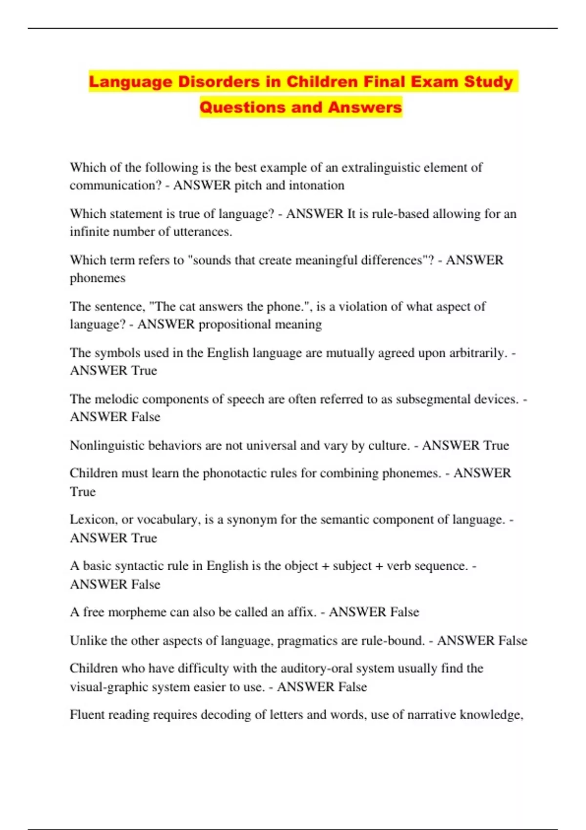 Language Disorders in Children Final Exam Study Questions and Answers...