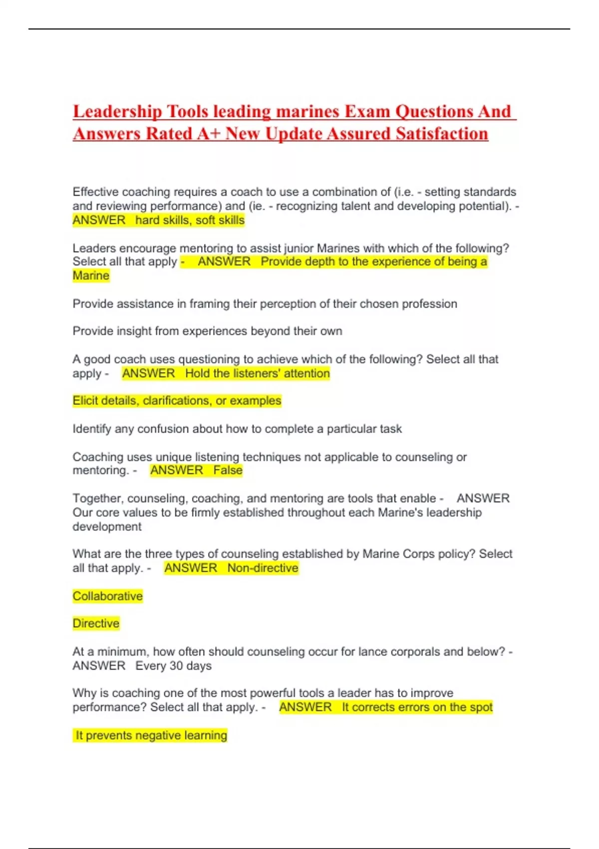 Leadership Tools leading marines Exam Questions And Answers Rated A+ New Update Assured Satisfaction