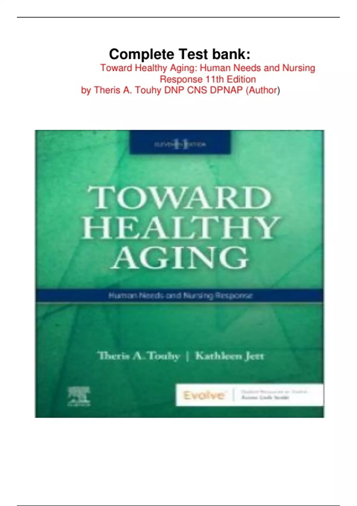 Complete Test bank: Toward Healthy Aging: Human Needs and Nursing Response 11th Edition by Human Needs and Nursing Response 11th Edition by Theris A. Touhy DNP CNS DPNAP (Author)