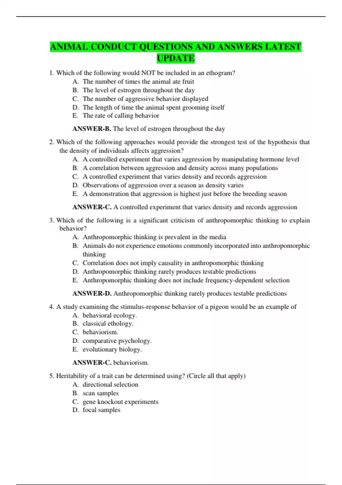 1. Which of the following would NOT be included in an ethogram? A. The number of times the animal ate fruit B. The level of estrogen throughout the day C. The number of aggressive behavior displayed D. The length of time the animal spent grooming itself E. The rate of calling behavior ANSWER-B. The level of estrogen throughout the day 2. Which of the following approaches would provide the strongest test of the hypothesis that the density of individuals affects aggression? A. A controlled experiment that varies aggression by manipulating hormone level B. A correlation between aggression and density across many populations C. A controlled experiment that varies density and records aggression D. Observations of aggression over a season as density varies E. A demonstration that aggression is highest just before the breeding season ANSWER-C. A controlled experiment that varies density and records aggression 3. Which of the following is a significant criticism of anthropomorphic thinking to explain behavior? A. Anthropomorphic thinking is prevalent in the media B. Animals do not experience emotions commonly incorporated into anthropomorphic thinking C. Correlation does not imply causality in anthropomorphic thinking D. Anthropomorphic thinking rarely produces testable predictions E. Anthropomorphic thinking does not include frequency-dependent selection ANSWER-D. Anthropomorphic thinking rarely produces testable predictions 4. A study examining the stimulus-response behavior of a pigeon would be an example of A. behavioral ecology. B. classical ethology. C. behaviorism. D. comparative psychology. E. evolutionary biology. ANSWER-C. behaviorism.