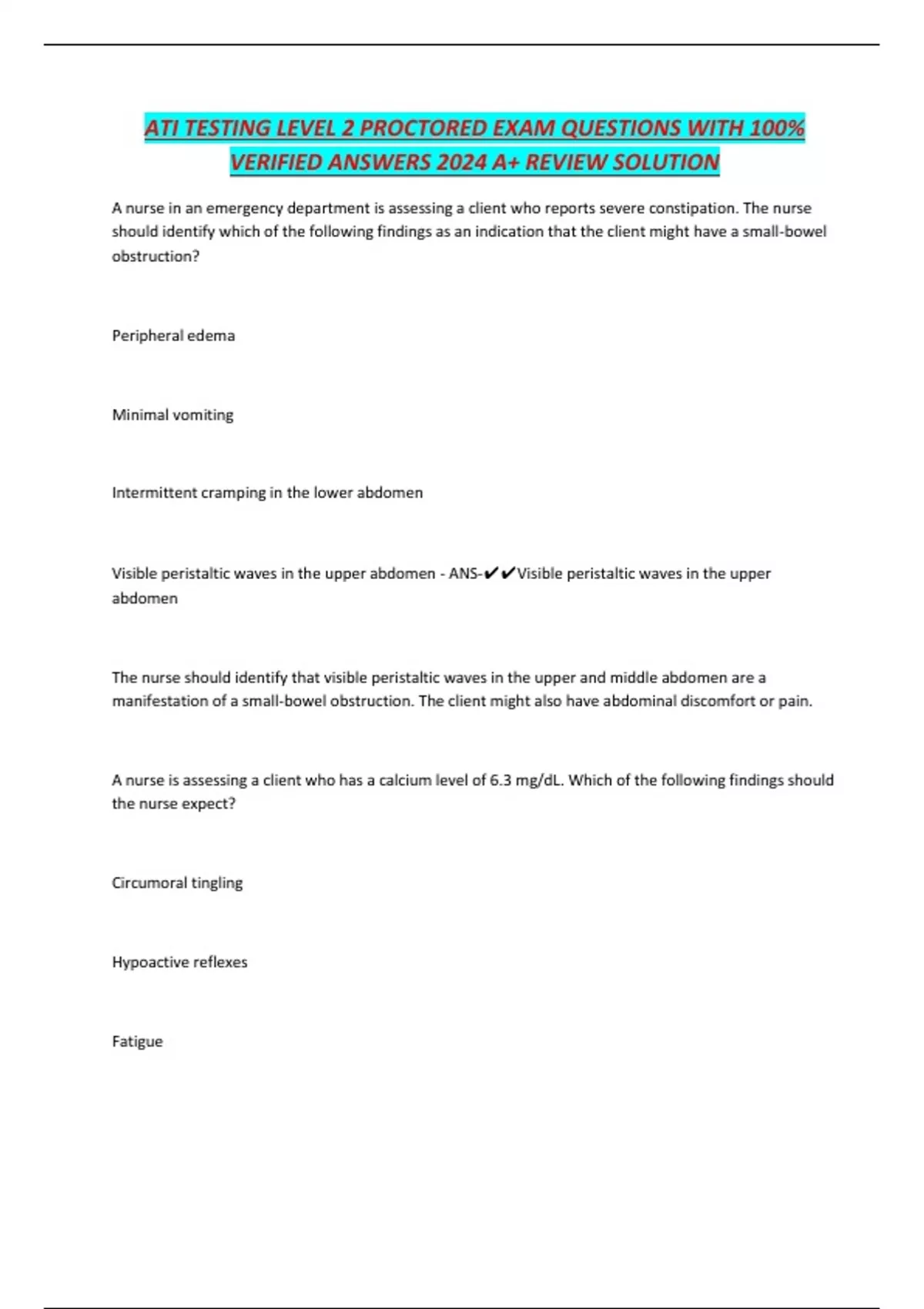 ATI TESTING LEVEL 2 PROCTORED EXAM QUESTIONS WITH 100% VERIFIED ANSWERS 2024 A+ REVIEW SOLUTION A nurse in an emergency department is assessing a client who reports severe constipation. The nurse should identify which of the following findings as an indication that the client might have a small-bowel obstruction? Peripheral edema Minimal vomiting Intermittent cramping in the lower abdomen Visible peristaltic waves in the upper abdomen - ANS-Visible peristaltic waves in the upper abdomen The nurse should identify that visible peristaltic waves in the upper and middle abdomen are a manifestation of a small-bowel obstruction. The client might also have abdominal discomfort or pain. A nurse is assessing a client who has a calcium level of 6.3 mg/dL. Which of the following findings should the nurse expect? Circumoral tingling Hypoactive reflexes Fatigue Anorexia - ANS-Circumoral tingling The nurse should identify that hypocalcemia causes paresthesias, which is circumoral numbness and tingling of the fingers, toes, and around the mouth. A nurse is teaching a client who has type 1 diabetes mellitus about actions to take when having manifestations of hypoglycemia with a glucometer reading between 40 and 60 mg/dL. Which of the following instructions should the nurse include? Self-administer 1 mg of glucagon subcutaneously. Self-administer 20 units of regular insulin. Drink 120 mL (4 oz) of skim milk. Drink 120 mL (4 oz) of fruit juice. - ANS-Drink 120 mL (4 oz) of fruit juice. The nurse should instruct the client to drink 120 mL (4 oz) of fruit juice, which will provide 10 to 15 g of carbohydrates to treat the hypoglycemia. A nurse is teaching a client who has asthma how to use a peak flow meter. Which of the following statements should the nurse identify as an indication the client understands the teaching? "I will blow out as hard as I can before I use the peak flow meter." "I will not take my controller medication if my peak flow meter scores in the yellow zone." CONTINUES...