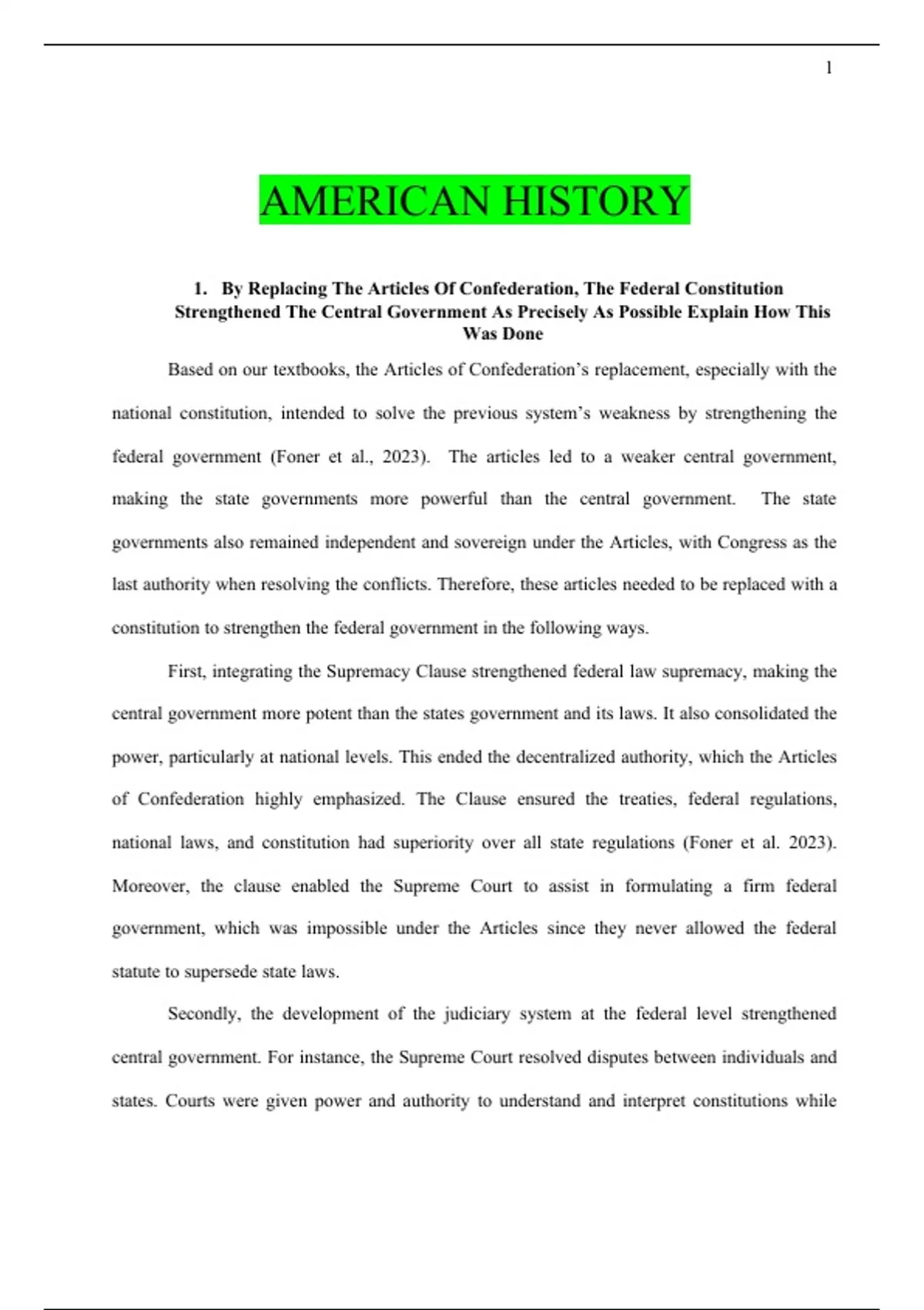 AMERICAN HISTORY 1. By Replacing The Articles Of Confederation, The Federal Constitution Strengthened The Central Government As Precisely As Possible Explain How This Was Done Based on our textbooks, the Articles of Confederation’s replacement, especially with the national constitution, intended to solve the previous system’s weakness by strengthening the federal government (Foner et al., 2023). The articles led to a weaker central government, making the state governments more powerful than the central government. The state governments also remained independent and sovereign under the Articles, with Congress as the last authority when resolving the conflicts. Therefore, these articles needed to be replaced with a constitution to strengthen the federal government in the following ways. First, integrating the Supremacy Clause strengthened federal law supremacy, making the central government more potent than the states government and its laws. It also consolidated the power, particularly at national levels. This ended the decentralized authority, which the Articles of Confederation highly emphasized. The Clause ensured the treaties, federal regulations, national laws, and constitution had superiority over all state regulations (Foner et al. 2023). Moreover, the clause enabled the Supreme Court to assist in formulating a firm federal government, which was impossible under the Articles since they never allowed the federal statute to supersede state laws. Secondly, the development of the judiciary system at the federal level strengthened central government. For instance, the Supreme Court resolved disputes between individuals and states. Courts were given power and authority to understand and interpret constitutions while ensuring supremacy and reinforcing national government functions and roles. Thirdly, a strong executive,