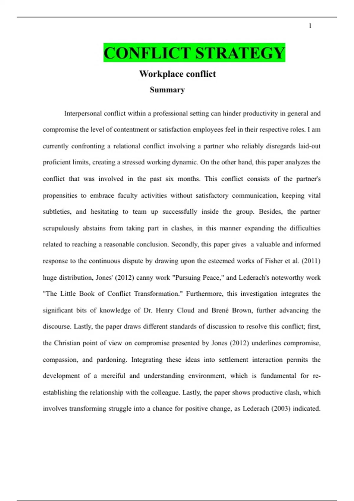 CONFLICT STRATEGY Workplace conflict Summary Interpersonal conflict within a professional setting can hinder productivity in general and compromise the level of contentment or satisfaction employees feel in their respective roles. I am currently confronting a relational conflict involving a partner who reliably disregards laid-out proficient limits, creating a stressed working dynamic. On the other hand, this paper analyzes the conflict that was involved in the past six months. This conflict consists of the partner's propensities to embrace faculty activities without satisfactory communication, keeping vital subtleties, and hesitating to team up successfully inside the group. Besides, the partner scrupulously abstains from taking part in clashes, in this manner expanding the difficulties related to reaching a reasonable conclusion. Secondly, this paper gives a valuable and informed response to the continuous dispute by drawing upon the esteemed works of Fisher et al. (2011) huge distribution, Jones' (2012) canny work "Pursuing Peace," and Lederach's noteworthy work "The Little Book of Conflict Transformation." Furthermore, this investigation integrates the significant bits of knowledge of Dr. Henry Cloud and Brené Brown, further advancing the discourse. Lastly, the paper draws different standards of discussion to resolve this conflict; first, the Christian point of view on compromise presented by Jones (2012) underlines compromise, compassion, and pardoning. Integrating these ideas into settlement interaction permits the development of a merciful and understanding environment, which is fundamental for re-establishing the relationship with the colleague. Lastly, the paper shows productive clash, which involves transforming struggle into a chance for positive