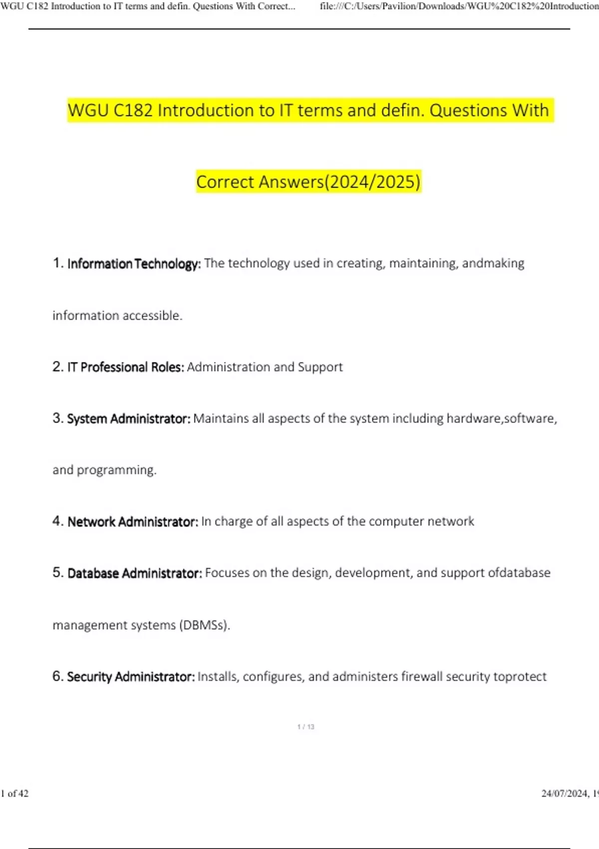WGU C182 Introduction to IT Questions and Answers (Latest 2024)|Information Technology..
