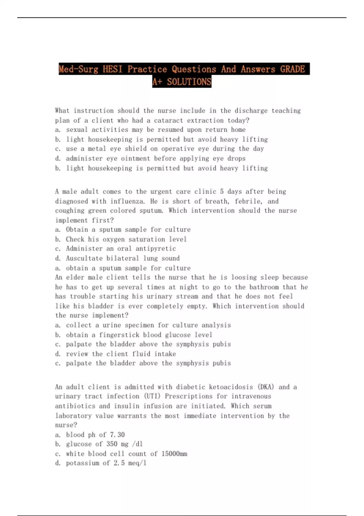 What instruction should the nurse include in the discharge teaching plan of a client who had a cataract extraction today? a. sexual activities may be resumed upon return home b. light housekeeping is permitted but avoid heavy lifting c. use a metal eye shield on operative eye during the day d. administer eye ointment before applying eye drops b. light housekeeping is permitted but avoid heavy lifting A male adult comes to the urgent care clinic 5 days after being diagnosed with influenza. He is short of breath, febrile, and coughing green colored sputum. Which intervention should the nurse implement first? a. Obtain a sputum sample for culture b. Check his oxygen saturation level c. Administer an oral antipyretic d. Auscultate bilateral lung sound a. obtain a sputum sample for culture An elder male client tells the nurse that he is loosing sleep because he has to get up several times at night to go to the bathroom that he has trouble starting his urinary stream and that he does not feel like his bladder is ever completely empty. Which intervention should the nurse implement? a. collect a urine specimen for culture analysis b. obtain a fingerstick blood glucose level c. palpate the bladder above the symphysis pubis d. review the client fluid intake c. palpate the bladder above the symphysis pubis An adult client is admitted with diabetic ketoacidosis (DKA) and a urinary tract infection (UTI) Prescriptions for intravenous antibiotics and insulin infusion are initiated. Which serum laboratory value warrants the most immediate intervention by the nurse? a. blood ph of 7.30 b. glucose of 350 mg /dl c. white blood cell count of 15000mm d. potassium of 2.5 meq/l d. potassium of 2.5 meq/l A client with sickle cell anemia develops a fever during the last hour of administration of a unit of packed red blood cell. When notifying the healthcare provider what information should the nurse provide first using the SBAR communication process? a. explain specific reason for urgent notification b. preface the report by stating the clients name and admitting diagnosis c. communicate the pre-transfusion temperatures d. optain prn prescription for acetaminophen for fever 101f a. explain specific reason for urgent notification An adult male client is admitted for pneumocystis carinil pneumonia (PCP) secondary to aids. While hospitalized he receives IV pentamidine isethionate therapy. In preparing this client for discharge what important aspect regarding his medication therapy should the nurse explain? a. AZT therapy must be stopped when IV aerosol pentamine is being used. b. IV pentamine will be given until oral pentamine can be tolerated c. It will be necessary to continue prophylactic doses of IV or aerosol pentamine every month d. IV pentamine may offer protection to others aids related conditions such as kaposis sarcoma c. it will be necessary to continue prophylactic doses of IV or aerosol pentamine every month A client subjective data includes dysuria, urgency, and urinary frequency. What action should the nurse implement next? a. collect a clean catch specimen b. palpate the suprapubic region c. instruct to wipe from front to back d. inquire about recent sexual activity a. collect a clean catch specimen A client tells the nurse that her biopsy results indicate that the cancer cells are well differentiated How should the nurse respond? a. offer the client reassurance that this information indicates that the clients cancer cells are benign b. explain that these tissue cells often respond more effectively to radiation than to chemotherapy c. ask the client if the healthcare provider has given her any information about the classification of her cancer d. help the client make plans to begin immediate treatment since her cancer is likely to spread quickly c. ask the client if the healthcare provider has given her any information about the classification of her cancer A client with a chronic kidney disease is treated on hemodialysis. During the 1 treatment clients blood pressure drops from 150/90 to 80/30 Which action should the nurse take first? a. monitor bp q45 minutes b. lower the head of the chair and elevate feet c. stop dialysis treatment d. administer 5% albumin IV c. stop dialysis treatment A client with deep vain thrombosis (DVT) is receiving a continues infusion of heparin sodium 25,000 unit in 5% dextrose injection 250ml. The prescription indicates the dosage should be increase 900 units/hr. The nurse should program the infusion pump to deliver how many ml/hr? 9 mL/hour The nurse is obtaining the admission history for a client with suspected peptic ulcer disease (PUD). Which subjective data reported by the client supports this diagnosis? a. upper mid abdominal gnawing and burning pain b. severe abdominal cramps and diarrhea after eating spicy foods c. marked loss of weight and appetite over the last few months d. use of chewable and liquid antacids for indigestion a. upper mid abdominal gnawing and burning pain The nurse is providing preoperative education for a jewish client schedule to receive a xenograft graft to promote burn healing. Which information should the nurse provide this client? a. the xenograft is taken from nonhuman sources b. grafting increases the risk for bacterial infection c. as the burn heals the graft permanently attaches d. grafts are later removed by debriding procedure a. the xenograft is taken from nonhuman sources A client who took a camping vacation two weeks ago in a country with a tropical climate comes to the clinic describing vague symptoms and diarrhea for the past week. Which finding is most important for the CONTINUED.....