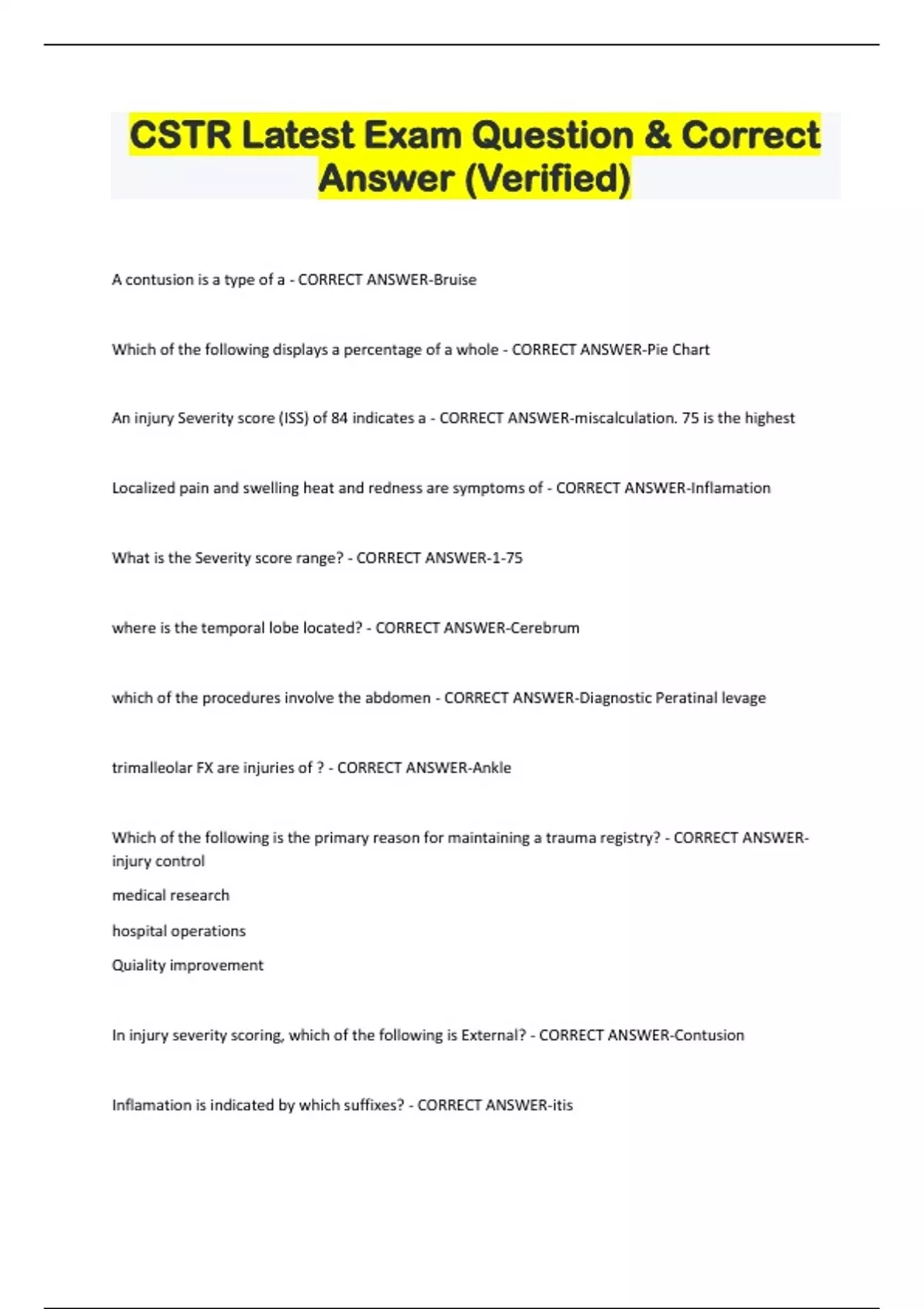 CSTR Latest Exam Question & Correct Answer (Verified) A contusion is a type of a - CORRECT ANSWER-Bruise Which of the following displays a percentage of a whole - CORRECT ANSWER-Pie Chart An injury Severity score (ISS) of 84 indicates a - CORRECT ANSWER-miscalculation. 75 is the highest Localized pain and swelling heat and redness are symptoms of - CORRECT ANSWER-Inflamation