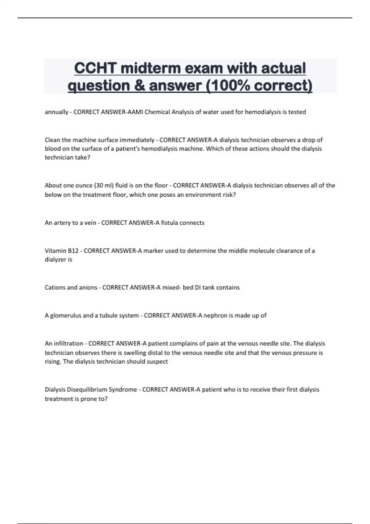CCHT midterm exam with actual question & answer (100% correct) annually - CORRECT ANSWER-AAMI Chemical Analysis of water used for hemodialysis is tested Clean the machine surface immediately - CORRECT ANSWER-A dialysis technician observes a drop of blood on the surface of a patient's hemodialysis machine. Which of these actions should the dialysis technician take? About one ounce (30 ml) fluid is on the floor - CORRECT ANSWER-A dialysis technician observes all of the below on the treatment floor, which one poses an environment risk