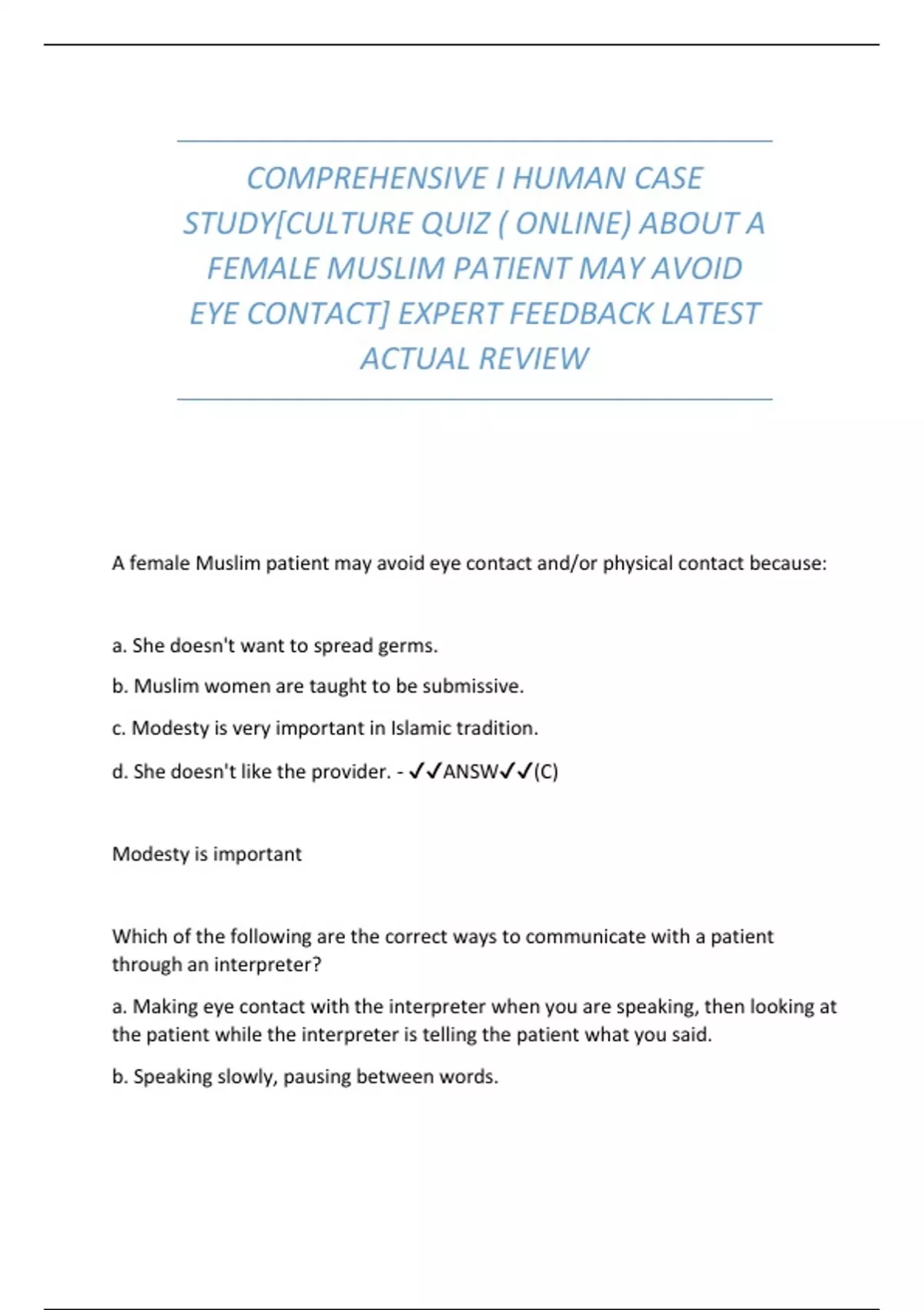 COMPREHENSIVE I HUMAN CASE STUDY[CULTURE QUIZ ( ONLINE) ABOUT A FEMALE MUSLIM PATIENT MAY AVOID EYE CONTACT] EXPERT FEEDBACK LATEST ACTUAL REVIEW