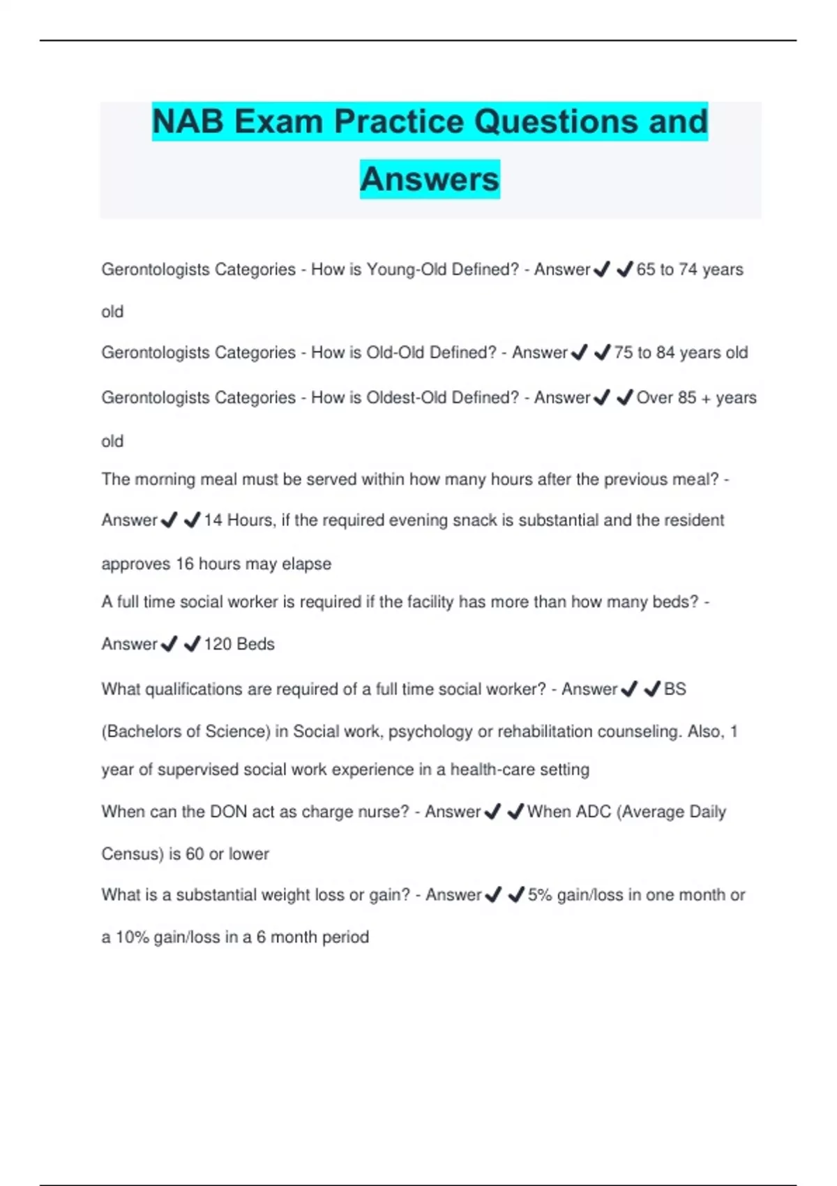 Gerontologists Categories - How is Young-Old Defined? - Answer️️ 65 to 74 years old Gerontologists Categories - How is Old-Old Defined? - Answer️️ 75 to 84 years old Gerontologists Categories - How is Oldest-Old Defined? - Answer️️ Over 85 + years old The morning meal must be served within how many hours after the previous meal? - Answer️️ 14 Hours, if the required evening snack is substantial and the resident approves 16 hours may elapse A full time social worker is required if the facility has more than how many beds? - Answer️️ 120 Beds What qualifications are required of a full time social worker? - Answer️️ BS (Bachelors of Science) in Social work, psychology or rehabilitation counseling. Also, 1 year of supervised social work experience in a health-care setting When can the DON act as charge nurse? - Answer️️ When ADC (Average Daily Census) is 60 or lower What is a substantial weight loss or gain? - Answer️️ 5% gain/loss in one month or a 10% gain/loss in a 6 month period