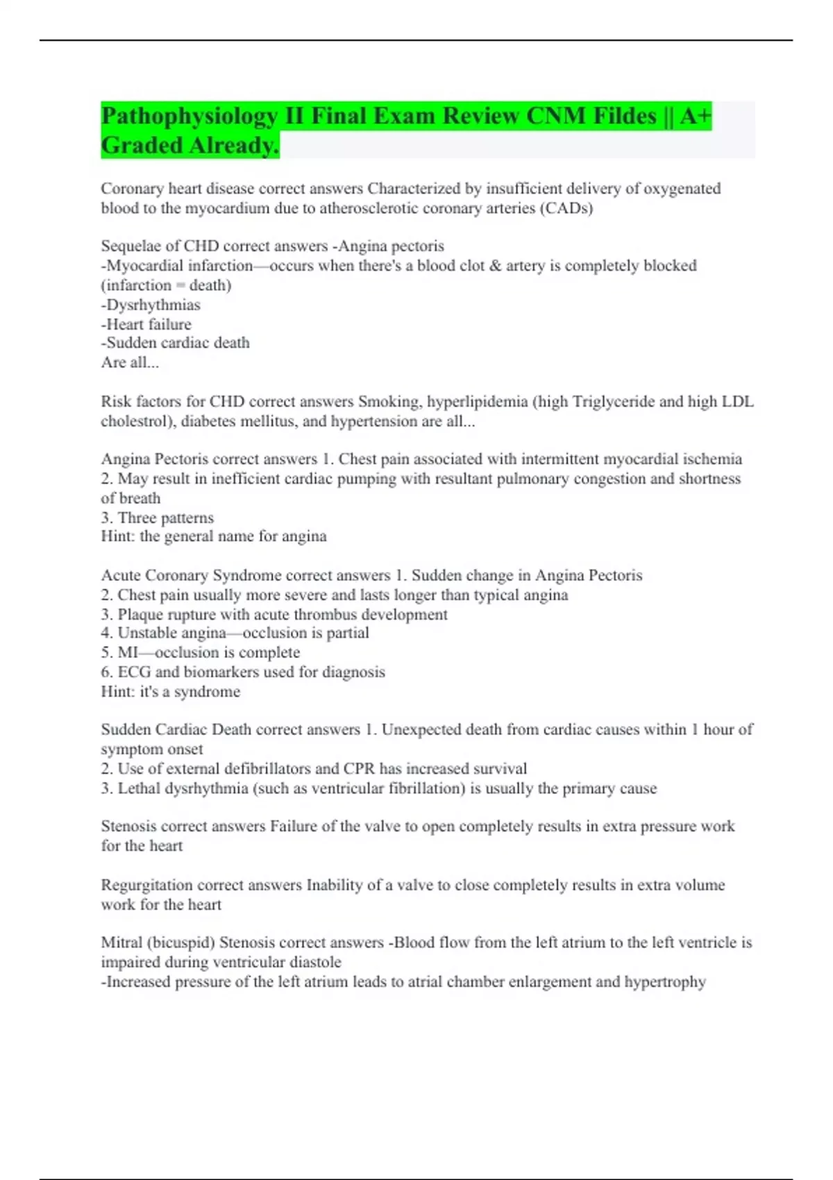 Coronary heart disease correct answers Characterized by insufficient delivery of oxygenated blood to the myocardium due to atherosclerotic coronary arteries (CADs) Sequelae of CHD correct answers -Angina pectoris -Myocardial infarction—occurs when there's a blood clot & artery is completely blocked (infarction = death) -Dysrhythmias -Heart failure -Sudden cardiac death Are all... Risk factors for CHD correct answers Smoking, hyperlipidemia (high Triglyceride and high LDL cholestrol), diabetes mellitus, and hypertension are all... Angina Pectoris correct answers 1. Chest pain associated with intermittent myocardial ischemia 2. May result in inefficient cardiac pumping with resultant pulmonary congestion and shortness of breath 3. Three patterns Hint: the general name for angina Acute Coronary Syndrome correct answers 1. Sudden change in Angina Pectoris 2. Chest pain usually more severe and lasts longer than typical angina 3. Plaque rupture with acute thrombus development 4. Unstable angina—occlusion is partial 5. MI—occlusion is complete 6. ECG and biomarkers used for diagnosis Hint: it's a syndrome Sudden Cardiac Death correct answers 1. Unexpected death from cardiac causes within 1 hour of symptom onset 2. Use of external defibrillators and CPR has increased survival 3. Lethal dysrhythmia (such as ventricular fibrillation) is usually the primary cause Stenosis correct answers Failure of the valve to open completely results in extra pressure work for the heart Regurgitation correct answers Inability of a valve to close completely results in extra volume work for the heart Mitral (bicuspid) Stenosis correct answers -Blood flow from the left atrium to the left ventricle is impaired during ventricular diastole -Increased pressure of the left atrium leads to atrial chamber enlargement and hypertrophy