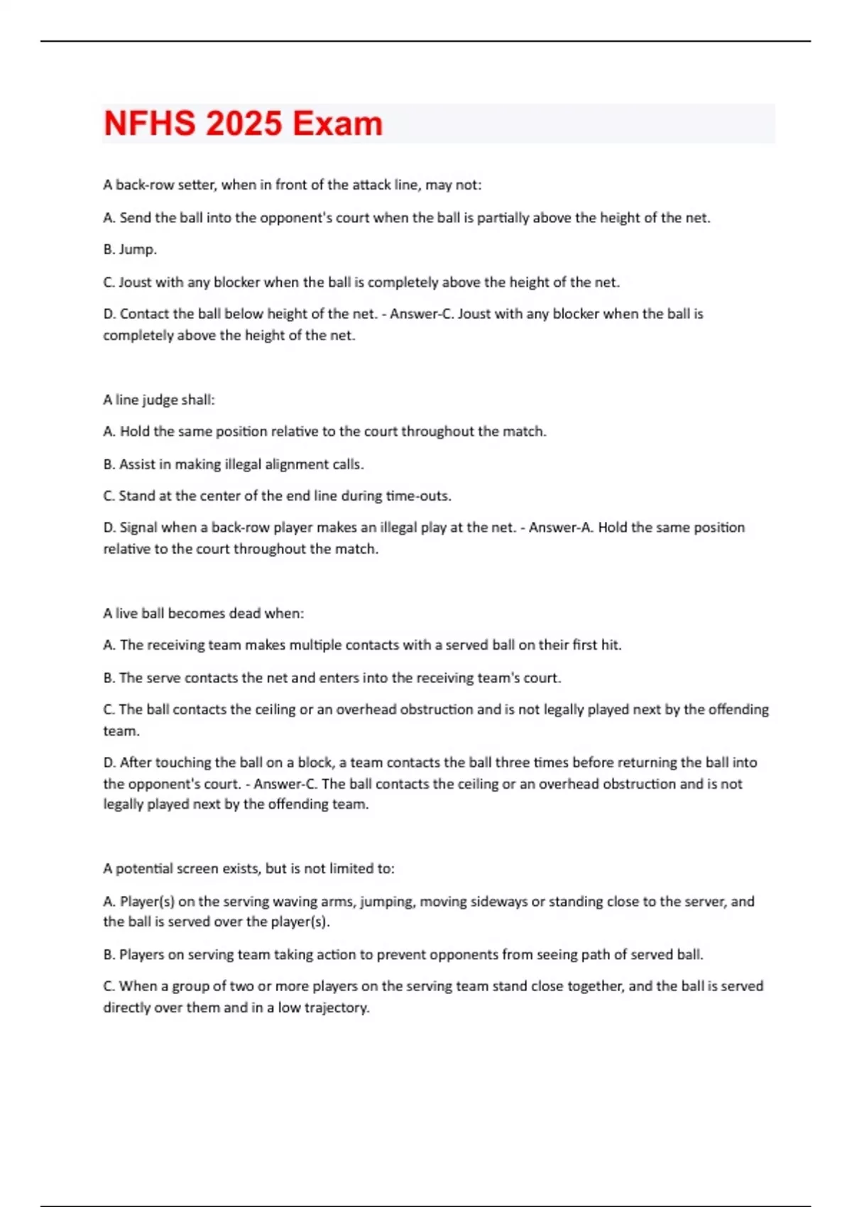 A back-row setter, when in front of the attack line, may not: A. Send the ball into the opponent's court when the ball is partially above the height of the net. B. Jump. C. Joust with any blocker when the ball is completely above the height of the net. D. Contact the ball below height of the net. - Answer-C. Joust with any blocker when the ball is completely above the height of the net. A line judge shall: A. Hold the same position relative to the court throughout the match. B. Assist in making illegal alignment calls. C. Stand at the center of the end line during time-outs. D. Signal when a back-row player makes an illegal play at the net. - Answer-A. Hold the same position relative to the court throughout the match. A live ball becomes dead when: A. The receiving team makes multiple contacts with a served ball on their first hit. B. The serve contacts the net and enters into the receiving team's court. C. The ball contacts the ceiling or an overhead obstruction and is not legally played next by the offending team. D. After touching the ball on a block, a team contacts the ball three times before returning the ball into the opponent's court. - Answer-C. The ball contacts the ceiling or an overhead obstruction and is not legally played next by the offending team. A potential screen exists, but is not limited to: A. Player(s) on the serving waving arms, jumping, moving sideways or standing close to the server, and the ball is served over the player(s). B. Players on serving team taking action to prevent opponents from seeing path of served ball. C. When a group of two or more players on the serving team stand close together, and the ball is served directly over them and in a low trajectory.D. All are correct. - Answer-D. All are correct. A referee shall stop play when a player gains an illegal advantage by contacting: A. Official's table. B. Team bench. C. Team members. D. All are illegal. - Answer-D. All are illegal. A serve is illegal and the ball remains dead if the server: A. Hits the ball illegally. B. Does not contact the ball to serve within 5 seconds. C. Is touching the endline or the floor outside the serving area when the ball is contacted. D. All are correct. - Answer-D. All are correct. A single, visible manufacturer's logo and/or single school name or insignia on each visible undergarment shall be: A. 4 by 4 inches B. 2.25 inches or less C. 2.75 inches D. 3 inches or less - Answer-B. 2.25 inches or less A spectator becomes unruly and disruptive to the orderly progress of the set. The individual responsible for resolving the situation is: A. The first referee. B. The second referee. C. The host management. D. Official scorere. - Answer-C. The host management.
