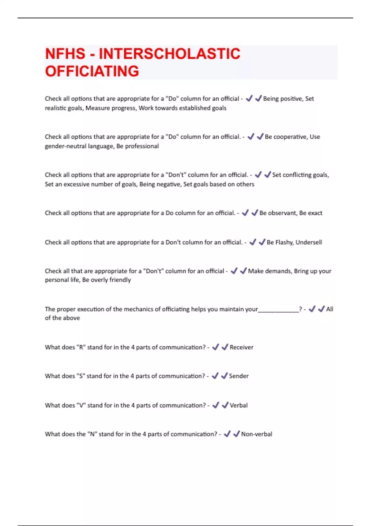 Check all options that are appropriate for a "Do" column for an official - Being positive, Set realistic goals, Measure progress, Work towards established goals Check all options that are appropriate for a "Do" column for an official. - Be cooperative, Use gender-neutral language, Be professional Check all options that are appropriate for a "Don't" column for an official. - Set conflicting goals, Set an excessive number of goals, Being negative, Set goals based on others Check all options that are appropriate for a Do column for an official. - Be observant, Be exact Check all options that are appropriate for a Don't column for an official. - Be Flashy, Undersell Check all that are appropriate for a "Don't" column for an official - Make demands, Bring up your personal life, Be overly friendly The proper execution of the mechanics of officiating helps you maintain your____________? - All of the above What does "R" stand for in the 4 parts of communication? - Receiver What does "S" stand for in the 4 parts of communication? - Sender What does "V" stand for in the 4 parts of communication? - Verbal What does the "N" stand for in the 4 parts of communication? - Non-verbal