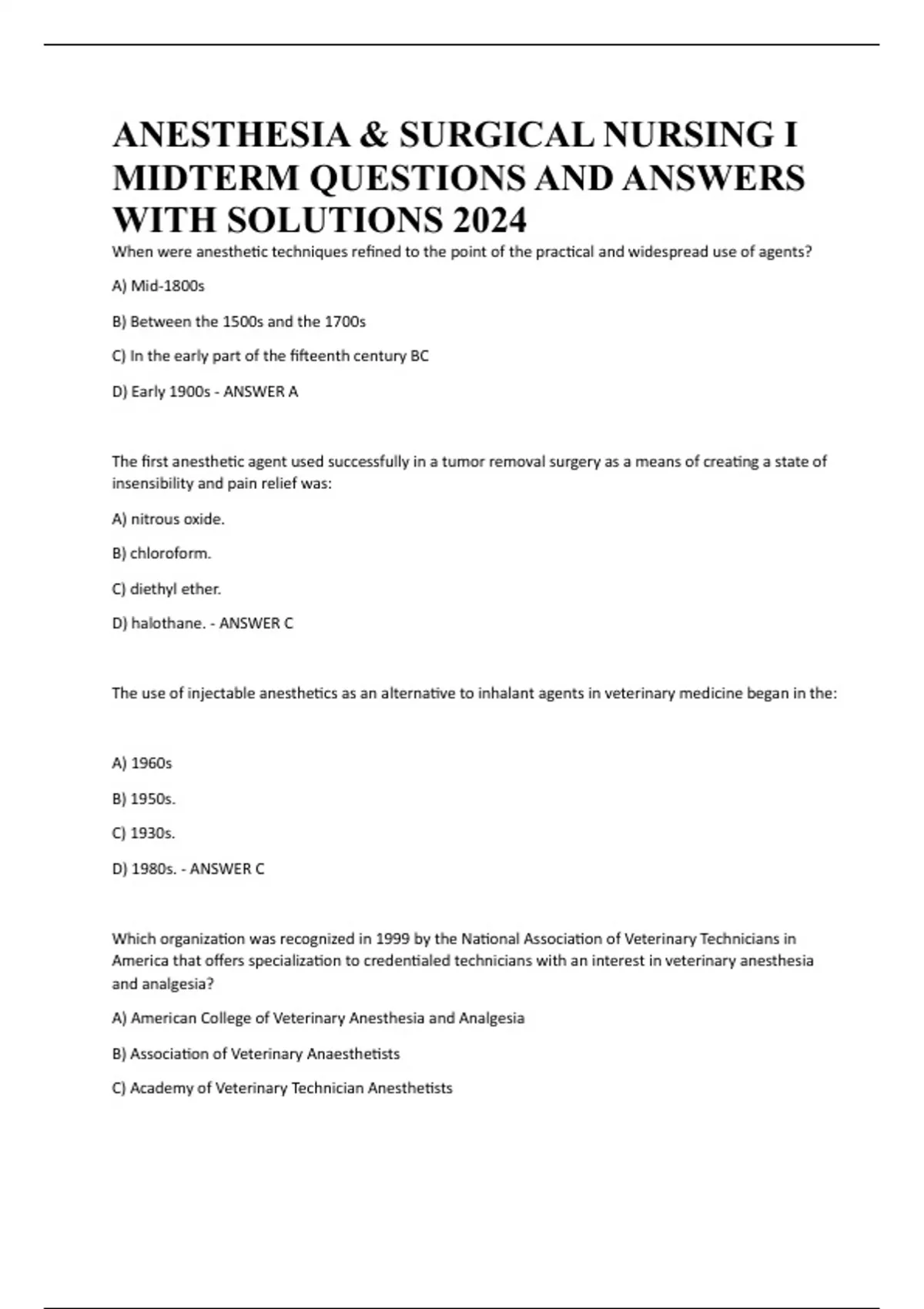 ANESTHESIA & SURGICAL NURSING I MIDTERM QUESTIONS AND ANSWERS WITH SOLUTIONS 2024