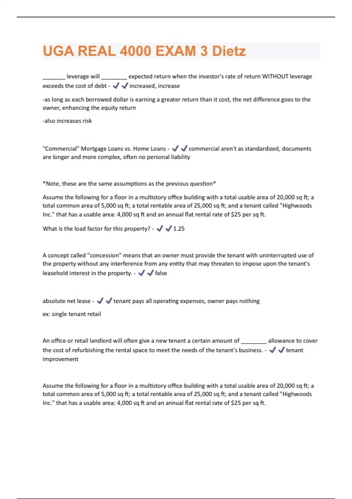 _______ leverage will ________ expected return when the investor's rate of return WITHOUT leverage exceeds the cost of debt - increased, increase -as long as each borrowed dollar is earning a greater return than it cost, the net difference goes to the owner, enhancing the equity return -also increases risk "Commercial" Mortgage Loans vs. Home Loans - commercial aren't as standardized, documents are longer and more complex, often no personal liability *Note, these are the same assumptions as the previous question* Assume the following for a floor in a multistory office building with a total usable area of 20,000 sq ft; a total common area of 5,000 sq ft; a total rentable area of 25,000 sq ft; and a tenant called "Highwoods Inc." that has a usable area: 4,000 sq ft and an annual flat rental rate of $25 per sq ft. What is the load factor for this property? - 1.25 A concept called "concession" means that an owner must provide the tenant with uninterrupted use of the property without any interference from any entity that may threaten to impose upon the tenant's leasehold interest in the property. - false absolute net lease - tenant pays all operating expenses, owner pays nothing ex: single tenant retail An office or retail landlord will often give a new tenant a certain amount of ________ allowance to cover the cost of refurbishing the rental space to meet the needs of the tenant's business. - tenant improvement Assume the following for a floor in a multistory office building with a total usable area of 20,000 sq ft; a total common area of 5,000 sq ft; a total rentable area of 25,000 sq ft; and a tenant called "Highwoods Inc." that has a usable area: 4,000 sq ft and an annual flat rental rate of $25 per sq ft.How much total rent does Highwoods Inc pay per year at this property? - $125,000 Assume you take a first and second loan on a commercial property; both are interest-only loans with one financing 60% of the purchase price at a 5% interest rate, and the other financing 20% of the purchase price at a 15% interest rate. Positive leverage would be created in the first year if the property was purchased with expected returns equivalent to ________________ - anything over a 6% going-in cap rate (unlevered IRR) Attractions of Balloon Mortgage to Lender - 1) Reduces interest rate risk to the lender on "permanent" mortgages 2) Reduces default risk (b/c risk in much greater for commercial mortgages) Before-tax cash flow (BTCF) formula - NOI-DS (debt service- annual mortgage payment) Cap rate (going in) formula - R(0) = NOI (1) / Acquisition price R(0)= overall income producing ability of the property or one-year return on total investment Carve out clause - Holds borrowers personally liable for lender losses caused by such problems Class A office building - -most desirable and new buildings in a particular market -highest rental rates -newer Class B office building - -A relatively new property with some, but not all, of the amenities of a Class A property. -less impressive Class C office building - -Typically an older property with few amenities -Often located in less desirable areas. -maintained but are below current standardsCons of ratios & multipliers - 1. No clear benchmarks for acceptable range 2. Only a partial view performance 3. No explicit assumptions about future Debt coverage ratio formula (DCR) - DCR= net operating income (NOI)/ debt service (DS) - to see how much NOI can decline before it will not cover debt service Debt service = - NOI(1)/DCR debt yield ratio (DYR) formula - DYR= net operating income/ loan amount -to indicate the expected overall return on the loan proceeds double net lease - tenant is responsible for paying rent, property taxes, and insurance, owner pays everything else ex: industrial (rare) Effective Gross Income Multiplier (EGIM) formula - EGIM= Acquisition price/Effective gross income -use only among properties with similar operating expenses and CAPX -measures price per current dollar of EGI Equity dividend rate (EDR) or cash-on-cash returns formula - EDR= BTCF/ equity investment -indicates the investor's one-period rate of return on invested equity Estimating NOI over next year formula - PGI -VC +MI -------- =EGI-OE -CAPX --------- =NOI estoppel certificate - required certificates from tenants stating that the leases are in "full force and effect" or if not, specifying defaults by the landlord Fixed rate commercial mortgage loans - -partially amortized "balloon" mortgage -25-30 year amort of principle -5-10 year loan maturity flat rent - the rental rate is fixed for the entire term. (most common)