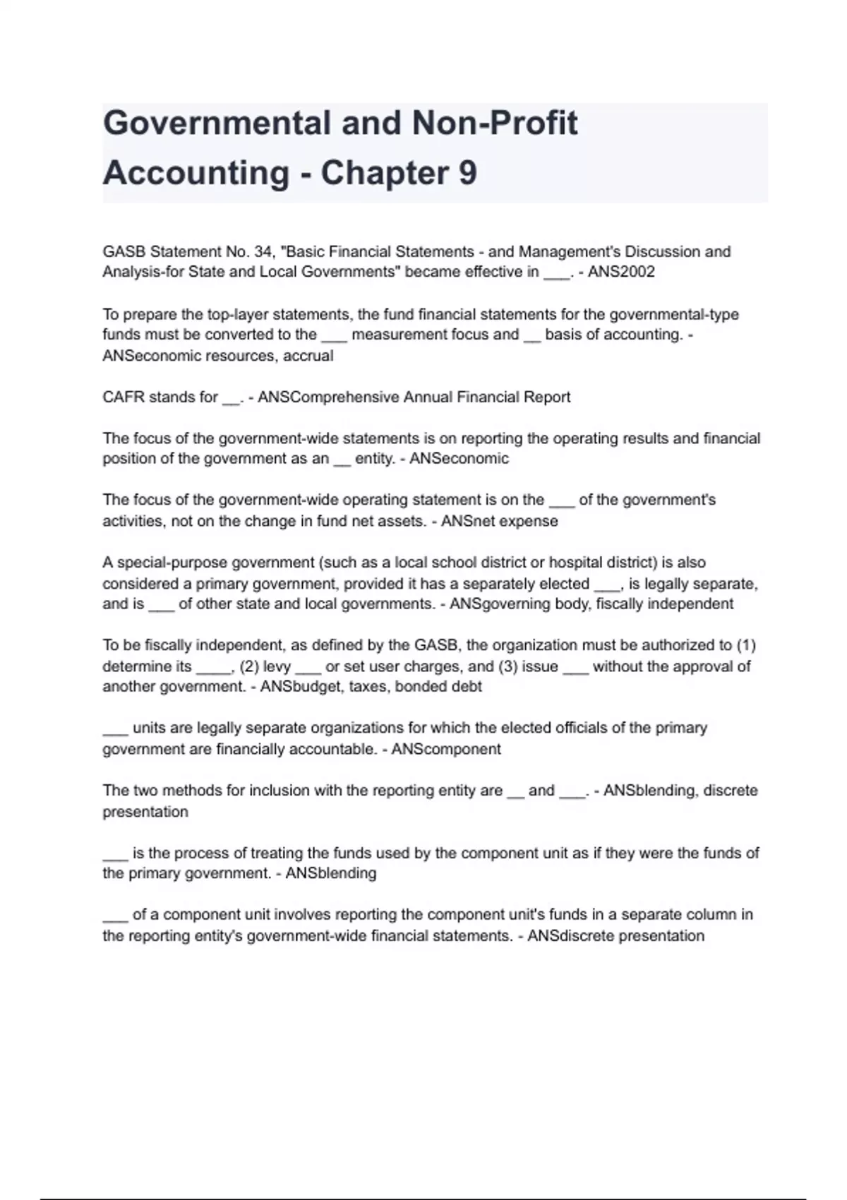 Governmental and Non-Profit Accounting - Chapter 9Test Bank