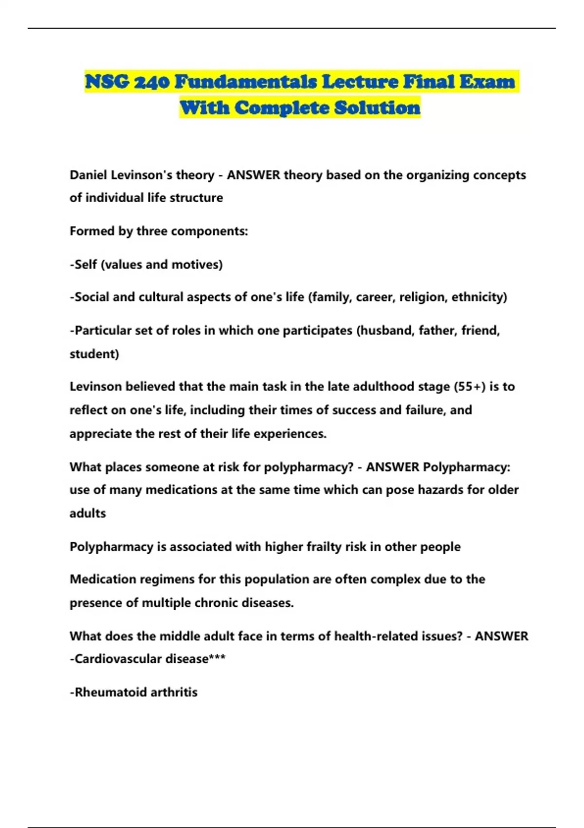 NSG 240 Fundamentals Lecture Final Exam With Complete Solution...