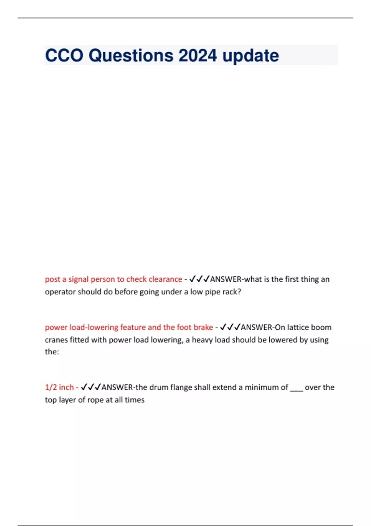 CCO Questions 2024 update post a signal person to check clearance - ANSWER-what is the first thing an operator should do before going under a low pipe rack? power load-lowering feature and the foot brake - ANSWER-On lattice boom cranes fitted with power load lowering, a heavy load should be lowered by using the: 1/2 inch - ANSWER-the drum flange shall extend a minimum of ___ over the top layer of rope at all times 1% - ANSWER-when lifting personnel, cranes must be level to within _______% grade. 10 - ANSWER-What is the safety factor required when using non rotating wire rope and lifting personnel in a man basket? 10 degrees - ANSWER-crane hooks must not be twisted in excess of: 10 ft - ANSWER-What is the minimum allowable distance from the crane and power lines 50kV in table A? 10 ft - ANSWER-When assembling a lattice boom on most crawler cranes using inserts of different lengths, which insert generally should be closest to the boom foot? 10 ft. - ANSWER-when crane is in transit and you are required to pass under power lines that are 51kV. What is OSHA's minimum required clearance? 100% of the weight of the crane and the suspended load - ANSWER-a crane's ground pressure can approach a weight that is: 110% - ANSWER-test loads shall not exceed _____ of manufacturers load ratings 15 ft. - ANSWER-according to ASME B30.5 the prohibited zone for working near power lines that are 60 kV, is: 15,100 - ANSWER-the jib capacity is 8 tons and the ball weight 900 lbs. what is the heaviest load that can be lifted safety? 15% of its original size - ANSWER-a crane hooks throat open must not exceed: 2 - ANSWER-OSHA requires you to always have at least how many wraps on a hoist drum? 2 - ANSWER-what is the maximum number of broken wires acceptable before replacement on a standing wire rope? 20 mph - ANSWER-According to ANSI B30.23 personnel platform lifts should not be made with wind in excess of: 20,000 lbs. - ANSWER-a lattice boom truck crane with a 120 ft. boom will be operating at a 42 ft. radius. the load chart shows an entry indicating 25,000 lbs at a 40 ft. radius, followed immediately by an entry listing 20,000 lbs at a 45 ft. radius. what is the crane;s capacity at the 42 ft. radius? 3 - ANSWER-How many broken wires must be present in one strand of one lay running wire rope to be removed from service?