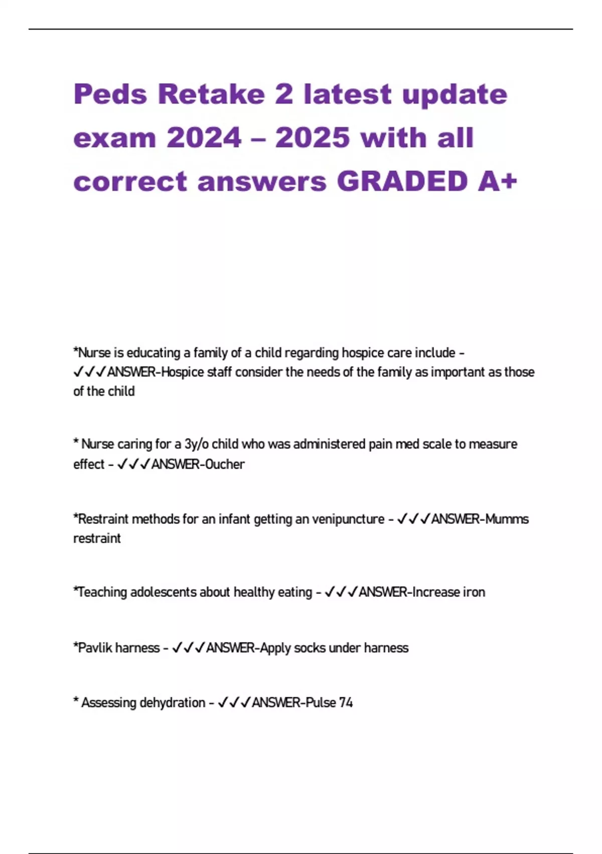 Peds Retake 2 latest update exam 2024 – 2025 with all correct answers GRADED A+ *Nurse is educating a family of a child regarding hospice care include - ANSWER-Hospice staff consider the needs of the family as important as those of the child * Nurse caring for a 3y/o child who was administered pain med scale to measure effect - ANSWER-Oucher *Restraint methods for an infant getting an venipuncture - ANSWER-Mumms restraint *Teaching adolescents about healthy eating - ANSWER-Increase iron *Pavlik harness - ANSWER-Apply socks under harness * Assessing dehydration - ANSWER-Pulse 74 *Parent understanding of digoxin administration - ANSWER-Drink water after taking medication *Withholding digoxin - ANSWER-HR 64 *Skeletal traction - ANSWER-Pin care *Toddler sun protectant - ANSWER-Should wear a brim hat * School age child with head injury has ICP what VS is consistent with ICP? - ANSWER-Respiration of 23-25 bpm *Math - ANSWER-0.79ml *Cystic fibrosis - ANSWER-Persistent postural drainage BID *Head injury - ANSWER-Initiate seizure precaution *Locating Koplik spots - ANSWER-Mouth exhibit *Planning post op care for Meckel Diverticulum - ANSWER-NG tube *Preforming peritoneal dialysis - ANSWER-Weigh the child *Radiation therapy SATA - ANSWER-Mild exercise Don't bath for long periods of time *Burns appropriate interventions - ANSWER-??? *Post op care for cleft lip palate repair - ANSWER-Use bulb syringe to suction oral secretions *Child who heart failure - ANSWER-Restless *Epiglottis SATA - ANSWER-Droplet precuation Humidifier Assess throat *Priorty finding for child who has asthma before administering aerosol - ANSWER-Respiratory rate * Suggestions for parent that child refuses to go to bed - ANSWER-Use a night light *Fractures monitoring post op complications - ANSWER-No pedal pulse *Failure to thrive - ANSWER-Persistent nursing care