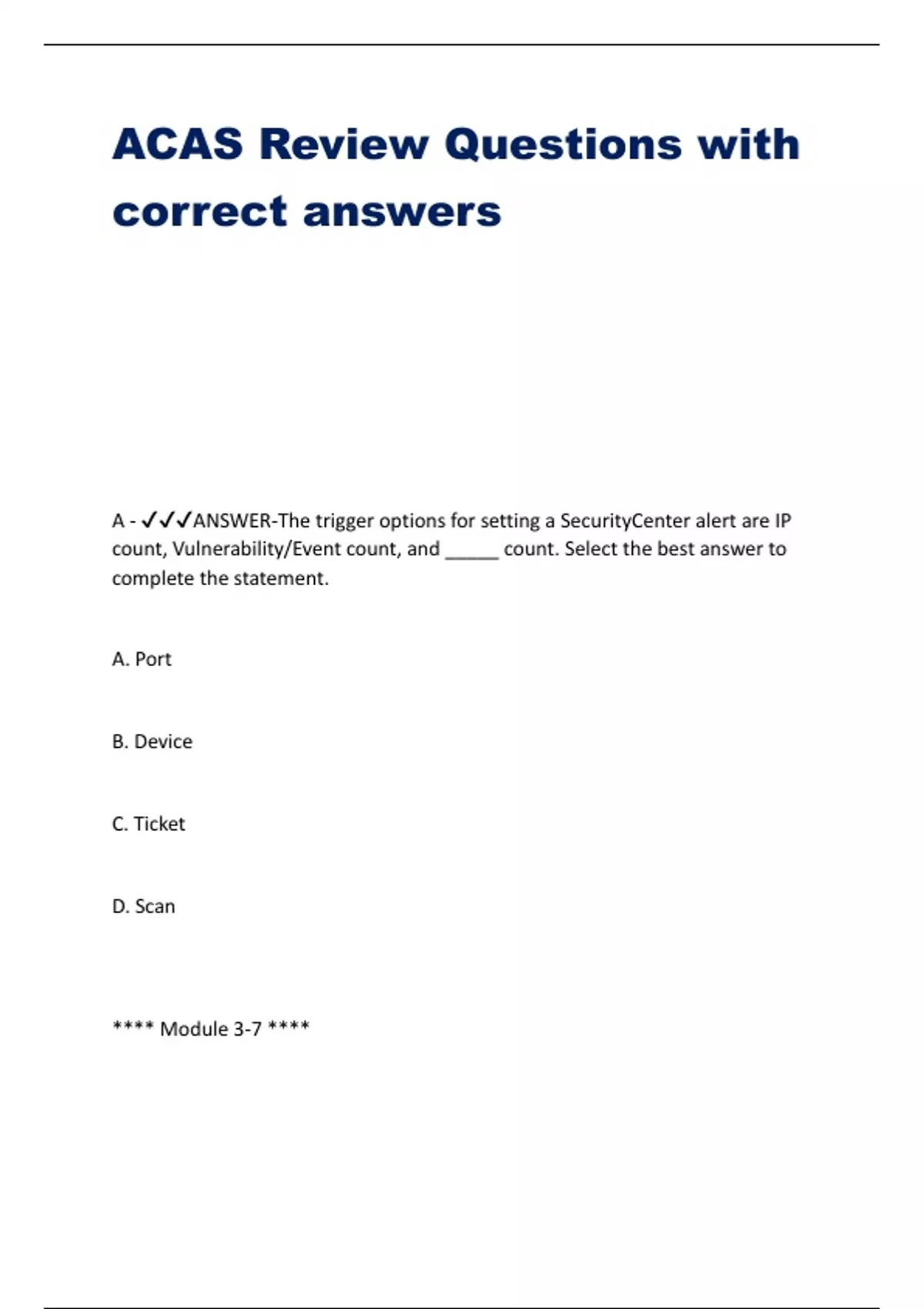 ACAS Review Questions with correct answers A - ANSWER-The trigger options for setting a SecurityCenter alert are IP count, Vulnerability/Event count, and _____ count. Select the best answer to complete the statement. A. Port B. Device C. Ticket D. Scan **** Module 3-7 **** A - ANSWER-What is ACAS? Select the best answer. A. ACAS is a network-based security compliance and assessment capability designed to provide awareness of the security posture and network health of DoD networks. B. ACAS is a system that ensures security for the DoD networks. C. ACAS is a system that monitors and corrects vulnerabilities to provide security for the DoD networks. D. All of the above **** Module 1-1 **** A - ANSWER-What is the function of Performance Options in the Scan Policy? Select the best answer. A. Determines the impact of a scan related to scan times and network behavior B. Determines how a scan will behave C. Describes how a scan will be shared across organizations D. Sets the port range of a scan **** Module 1-4 **** A - ANSWER-What SecurityCenter role is responsible for setting up scan zones? Select the best answer. A. Administrator B. Manager C. Security Manager D. End User **** Module 1-3 **** A - ANSWER-What two ways can you use to add a dynamic asset list? Select the best answer. A. Use a template or create a set of rules B. Use a scan policy or a template