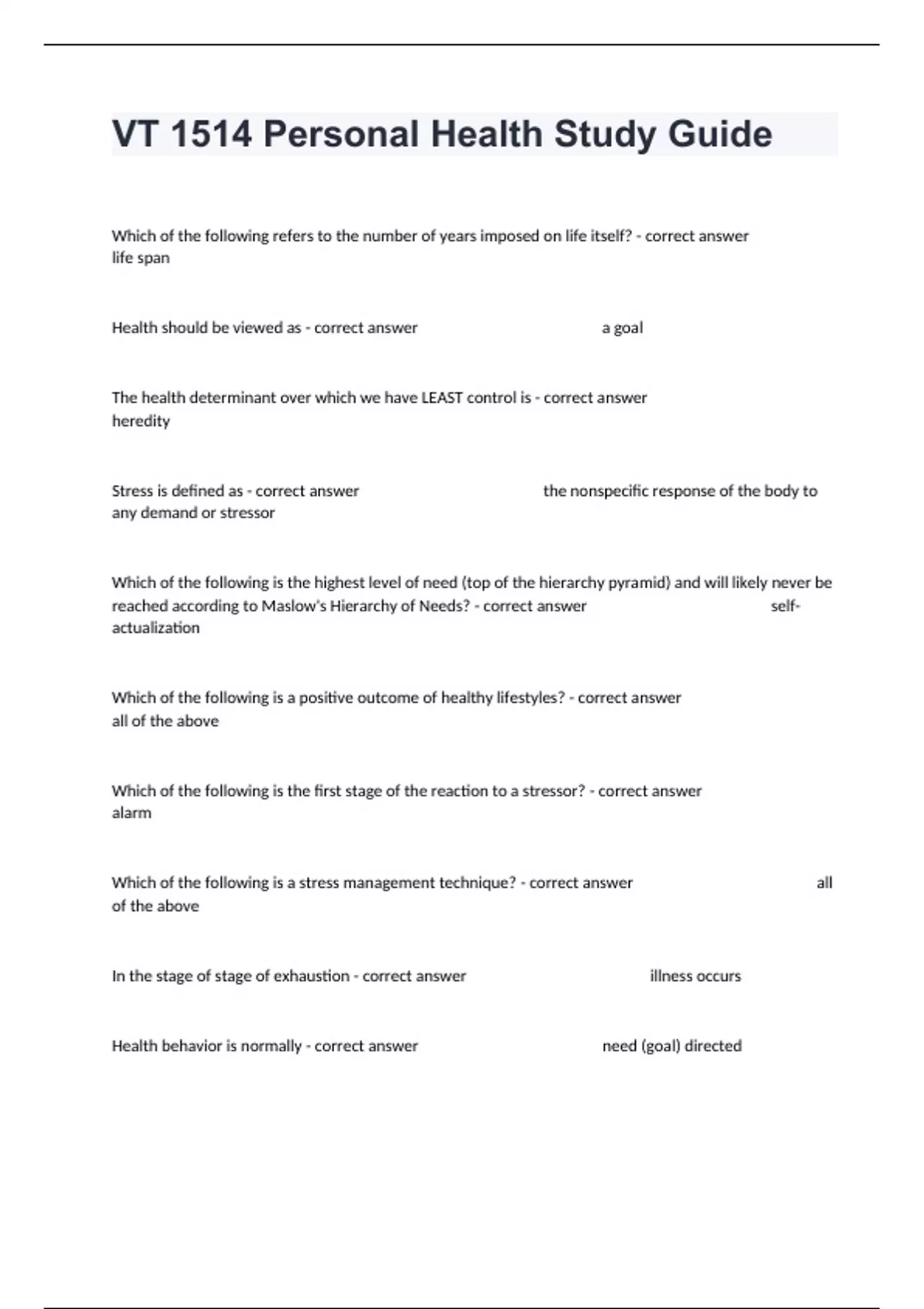 VT 1514 Personal Health Study Guide Complete Verified Guaranteed Answers Graded A+.