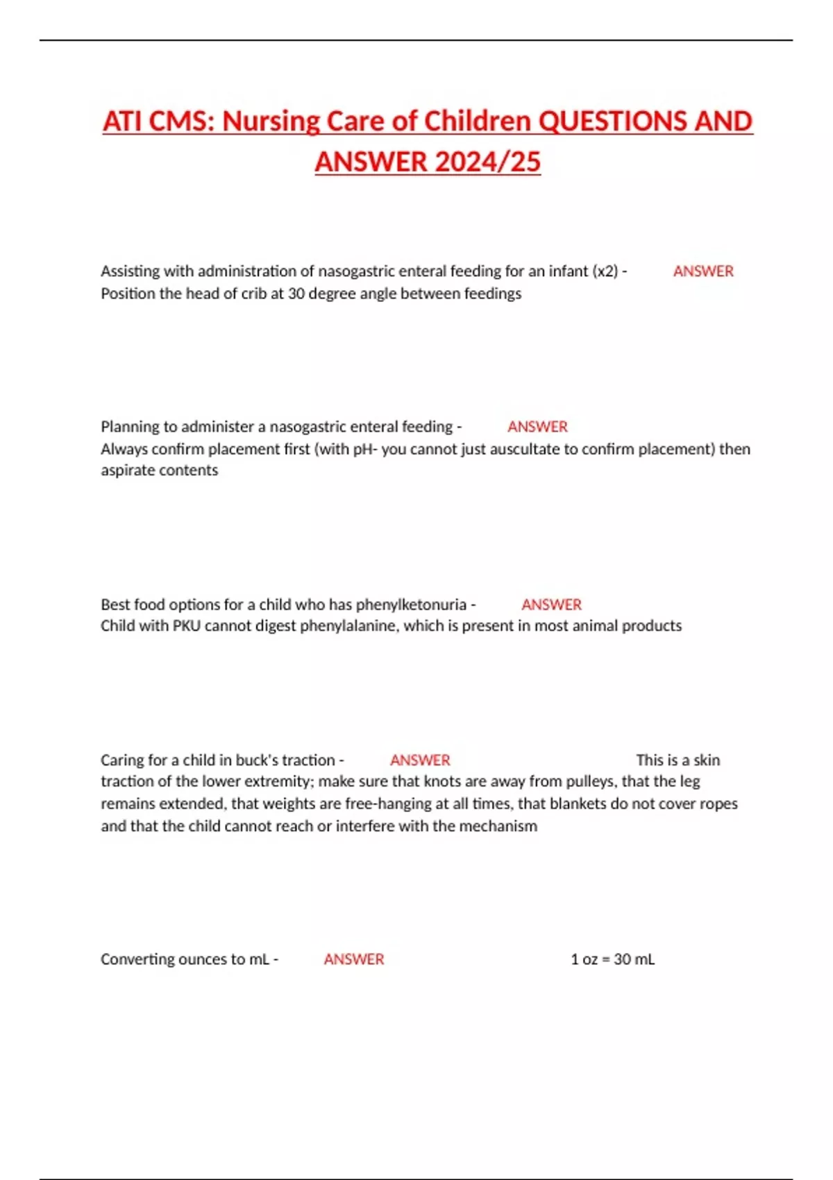 ATI CMS: Nursing Care of Children QUESTIONS AND ANSWER 2024/25 ATI CMS: Nursing Care of Children QUESTIONS AND ANSWER 2024/25