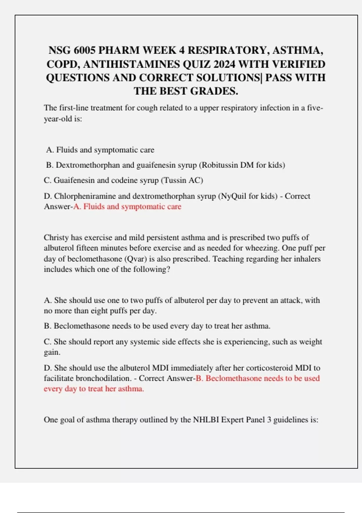 NSG 6005 PHARM WEEK 4 RESPIRATORY, ASTHMA, COPD, ANTIHISTAMINES QUIZ 2024 WITH VERIFIED QUESTIONS AND CORRECT SOLUTIONS| PASS WITH THE BEST GRADES.