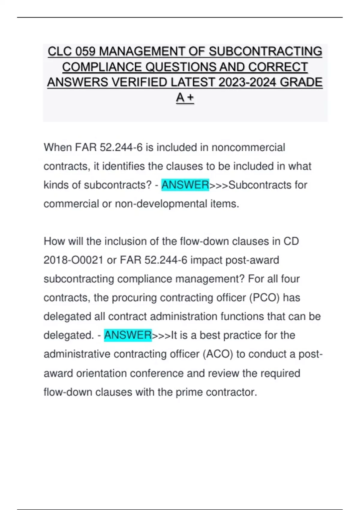 CLC 059 MANAGEMENT OF SUBCONTRACTING COMPLIANCE QUESTIONS AND CORRECT ANSWERS VERIFIED LATEST GRADE A +