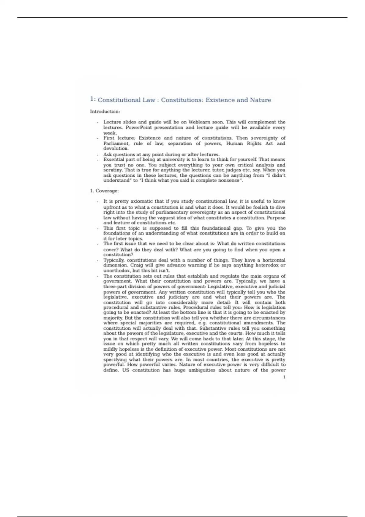 combined list of all the Constitutional Law lecture notes from over the term, right from the first topic of Constitutional statutes, to Rule of Law, and to Parliamentary Sovereignty, it is all covered above. Essential!! To your success in academics!!