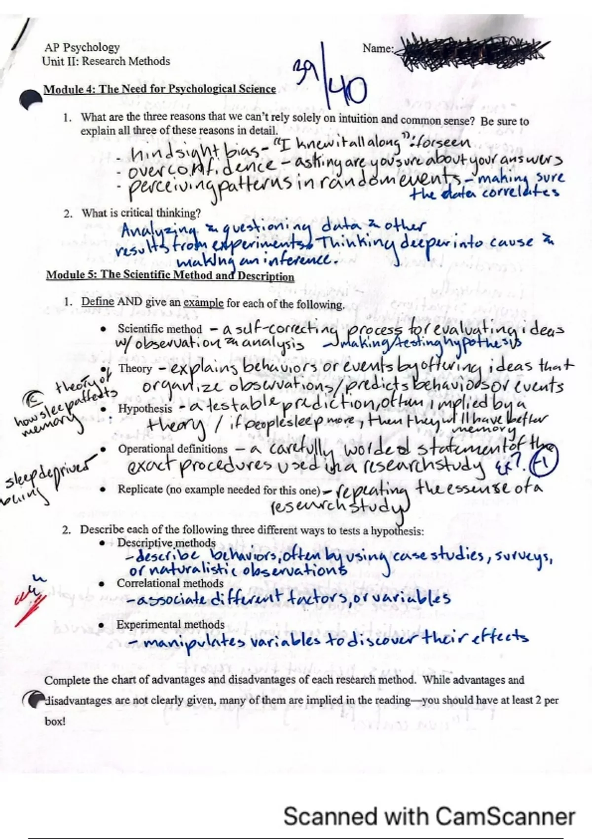 The AP Psychology course Unite 2 psychological science note packet is a completed study guide. Passed the class with an A average and got a 4 on exam.