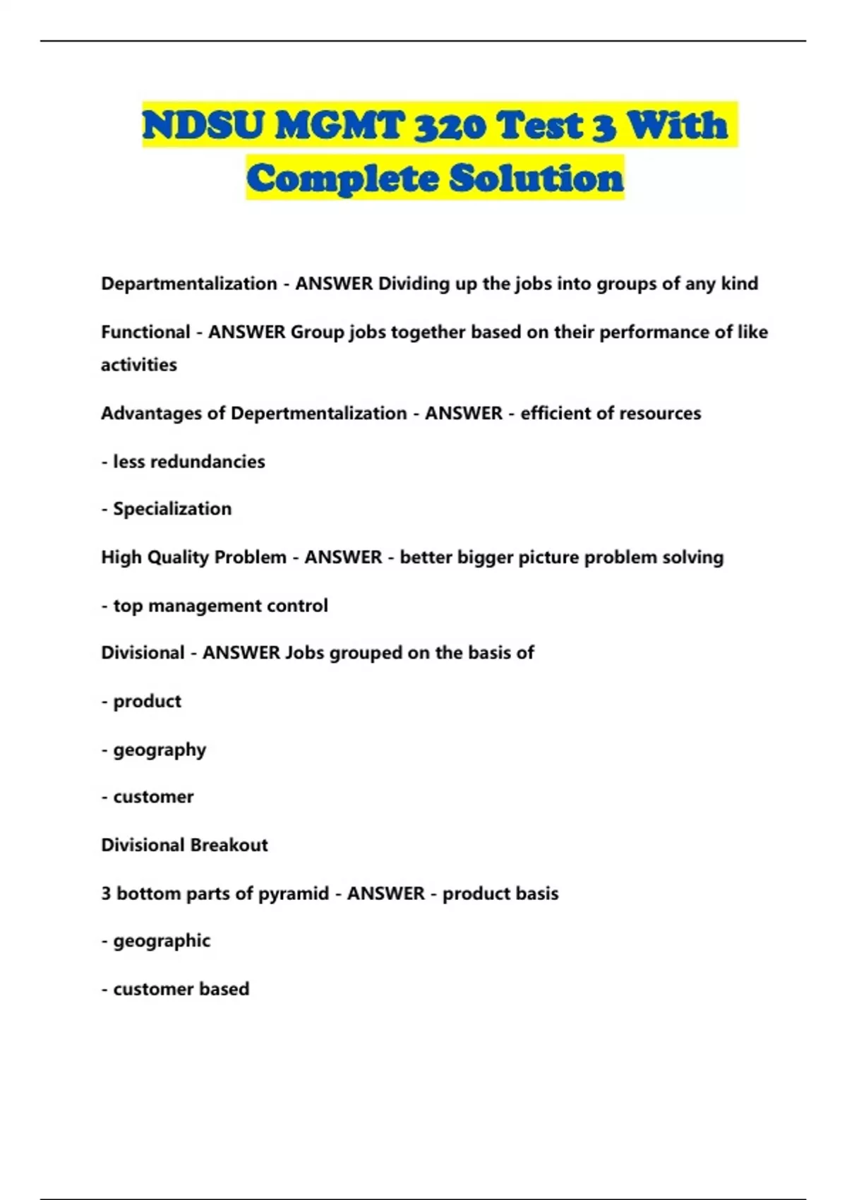 NDSU MG MT 32 0 Tes t 3 Wit h Comp lete Solut ion Departmentalization - ANSWER Dividing up the jobs into groups of any kind Functional - ANSWER Group jobs together based on their performance of like activities Advantages of Depertmentalization - ANSWER - efficient of resources - less redundancies - Specialization High Quality Problem - ANSWER - better bigger picture problem solving - top management control Divisional - ANSWER Jobs grouped on the basis of - product - geography - customer Divisional Breakout 3 bottom parts of pyramid - ANSWER - product basis - geographic - customer based Advantages of Divisional Structures - ANSWER - more responsive and flexible - better functional coordination Emphasis on overall divisional goals - ANSWER Develops General Manager - tend to at all levels think of the bigger picture - associate with the business they work in DIFFERENTLY than functional structure Functional Breakout - ANSWER - Mgmt control more centralized - slow responses Divisional Breakout - ANSWER - general managers (obtain subordinates) - fast decisions Matrix Structure - ANSWER Attempt to gain both benefits of the functional and divisional structure by having a line of authority for each - combines functional & divisional - very difficult to coordinate Many matrix structures fail because they violate unity of command - ANSWER - They tend to work more often than anywhere else in multi national corporations In order for a matrix to work, it needs to be at the top - ANSWER - When the matrix managers communicate directly with each other, not through the subordinates Issues with matrix near the top - ANSWER People near the top tend to work with very little to no supervision In multi national corporations the matrix... - ANSWER tends to work because the matrix managers serve as advisors rather than supervisors Virtual Structure - ANSWER Coordinating activities of businesses, that do not have common ownership, for a common purpose - Part of the business - Is outsourcing some function Accounting - ANSWER Manufacturing parts that you assembles - some companies don't have their own that need outsourcing - HR - Transportation Fully Virtual Structure - ANSWER No ownership of any of the functional processes Fully Virtual Structure - Pros - ANSWER Greatly reduces the need for capital investment Fully Virtual Structure - Cons - ANSWER Potential problems from the lack of control Coordination - ANSWER Through rules and communication Mechanistic - ANSWER - leads to efficiencies - relies on rules and centralized decision making Organic - ANSWER - Leads to greater responsiveness and flexibility - Relies on communications and decentralized decision making