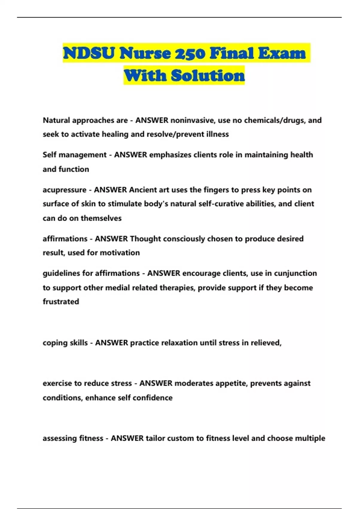 NDSU Nurse 250 Final Ex am With Sol ution Natural approaches are - ANSWER noninvasive, use no chemicals/drugs, and seek to activate healing and resolve/prevent illness Self management - ANSWER emphasizes clients role in maintaining health and function acupressure - ANSWER Ancient art uses the fingers to press key points on surface of skin to stimulate body's natural self-curative abilities, and client can do on themselves affirmations - ANSWER Thought consciously chosen to produce desired result, used for motivation guidelines for affirmations - ANSWER encourage clients, use in cunjunction to support other medial related therapies, provide support if they become frustrated coping skills - ANSWER practice relaxation until stress in relieved, exercise to reduce stress - ANSWER moderates appetite, prevents against conditions, enhance self confidence assessing fitness - ANSWER tailor custom to fitness level and choose multiple types of exercise dynamic arterial blood pressure - ANSWER higher systolic and pulse pressure, lower diastolic, and no MAP change static arterial blood pressure - ANSWER systolic, diastolic, and MAP increase, pulse pressure stays the same imagery - ANSWER use of symbols to imagine changes an individual desires uses for guided imagery - ANSWER decrease negative feelings, healing, problem solving, and can be used with therapy or music aromatherapy - ANSWER causes chemicals to be released that can make a person feel calm or stimulated aromatherapy administration methods - ANSWER aerial diffusion, direct inhalation, topical applications journal writing - ANSWER allows for learners to reflect and analyze on life experiences