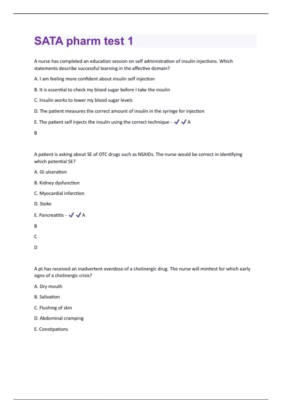 A nurse has completed an education session on self administration of insulin injections. Which statements describe successful learning in the affective domain? A. I am feeling more confident about insulin self injection B. It is essential to check my blood sugar before I take the insulin C. Insulin works to lower my blood sugar levels D. The patient measures the correct amount of insulin in the syringe for injection E. The patient self injects the insulin using the correct technique - A B A patient is asking about SE of OTC drugs such as NSAIDs. The nurse would be correct in identifying which potential SE? A. GI ulceration B. Kidney dysfunction C. Myocardial infarction D. Stoke E. Pancreatitis - A B C D A pt has received an inadvertent overdose of a cholinergic drug. The nurse will mintiest for which early signs of a cholinergic crisis? A. Dry mouth B. Salivation C. Flushing of skin D. Abdominal cramping E. ConstipationsF. Dyspnea - B C D F Adenergic blockade at the alpha adenergic receptors lead to which effects A. Vasodilation B. Decreased BP C. Increased BP D. Constriction of pupil E. Tachycardia - A