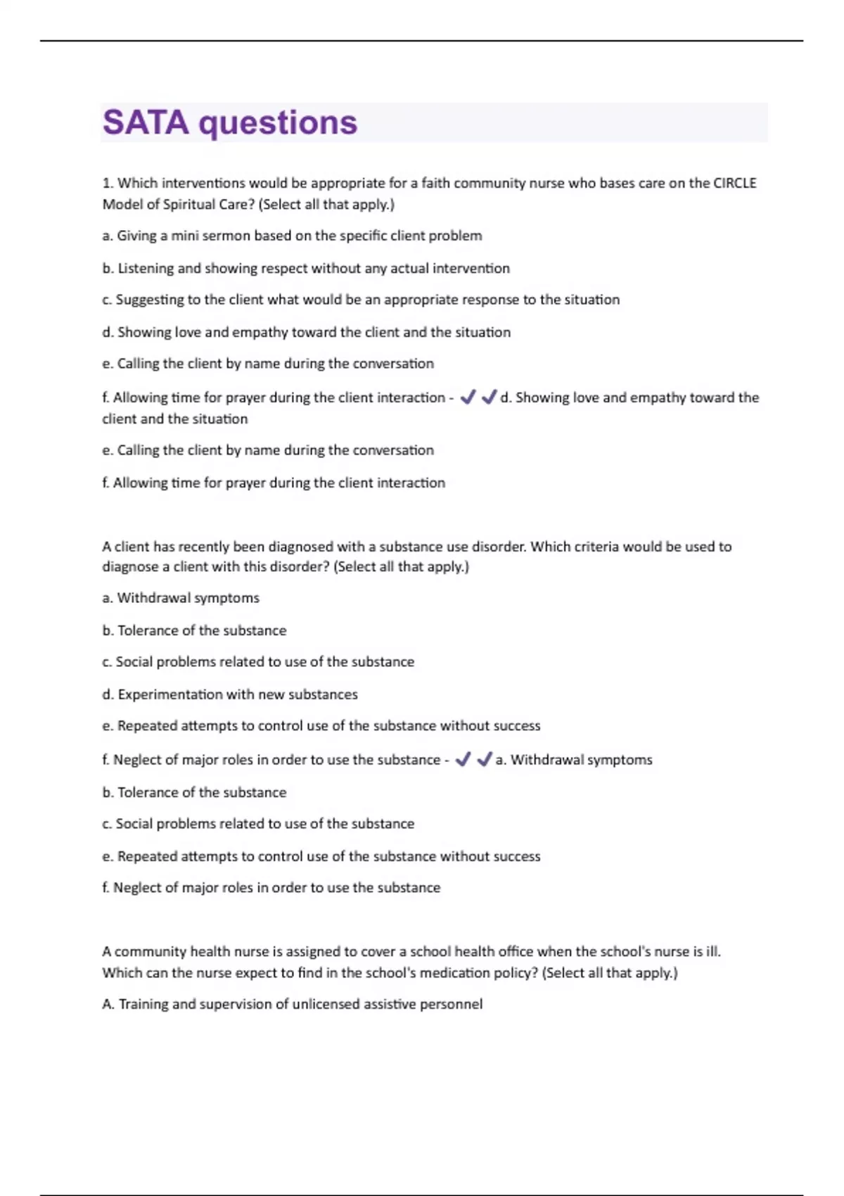 1. Which interventions would be appropriate for a faith community nurse who bases care on the CIRCLE Model of Spiritual Care? (Select all that apply.) a. Giving a mini sermon based on the specific client problem b. Listening and showing respect without any actual intervention c. Suggesting to the client what would be an appropriate response to the situation d. Showing love and empathy toward the client and the situation e. Calling the client by name during the conversation f. Allowing time for prayer during the client interaction - d. Showing love and empathy toward the client and the situation e. Calling the client by name during the conversation f. Allowing time for prayer during the client interaction A client has recently been diagnosed with a substance use disorder. Which criteria would be used to diagnose a client with this disorder? (Select all that apply.) a. Withdrawal symptoms b. Tolerance of the substance c. Social problems related to use of the substance d. Experimentation with new substances e. Repeated attempts to control use of the substance without success f. Neglect of major roles in order to use the substance - a. Withdrawal symptoms b. Tolerance of the substance c. Social problems related to use of the substance e. Repeated attempts to control use of the substance without success f. Neglect of major roles in order to use the substance A community health nurse is assigned to cover a school health office when the school's nurse is ill. Which can the nurse expect to find in the school's medication policy? (Select all that apply.) A. Training and supervision of unlicensed assistive personnelb. Proper labeling, storage, disposal, and transportation of medication c. Information about medications that are part of individualized education plans d. Written permission for administration of the medication by the physician e. Medication doses that exceed manufacturer's guidelines f. Student confidentiality - A. Training and supervision of unlicensed assistive personnel b. Proper labeling, storage, disposal, and transportation of medication e. Medication doses that exceed manufacturer's guidelines f. Student confidentiality A man was told by his boss that his work had really gone downhill recently and he had to improve or the boss would have to let him go. His wife had moved out of the apartment. Obviously, the drug use was causing problems. Which would cause the man to continue to use? (Select all that apply.) a. He had paid a lot for this stuff so he had just finished using what he had and then he had quit. b. He rationalized he was just hitting a rough spot and, as soon as he got over his wife's betrayal, he would quit using and his job would be fine. c. He tried to quit, but the withdrawal symptoms were so severe he could not. d. He verbalized quitting, but his new friends scoffed at him. e. His boss clearly did not understand what he was dealing with and had not a clue what pressure he was under—so ignoring him was the only option. f. He knew drug use made him legally handicapped so his boss could not fire him even if he wanted t - A. He had paid a lot for this stuff so he had just finished using what he had and then he had quit. b. He rationalized he was just hitting a rough spot and, as soon as he got over his wife's betrayal, he would quit using and his job would be fine. c. He tried to quit, but the withdrawal symptoms were so severe he could not. d. He verbalized quitting, but his new friends scoffed at him. A nurse has written a research proposal studying how technology can be used in innovative ways in rural areas to improve patient outcomes. Which should the nurse contact about funding opportunities? (Select all that apply.) A. Research Centers Program B. Health and Human Services Department (HHS)C. Health Resources and Services Administration (HRSA) D. Federal Office of Rural Health Policy E. Rural Health Research Gateway F. The Center for Rural Health at a local university - A. Research Centers Program D. Federal Office of Rural Health Policy F. The Center for Rural Health at a local university