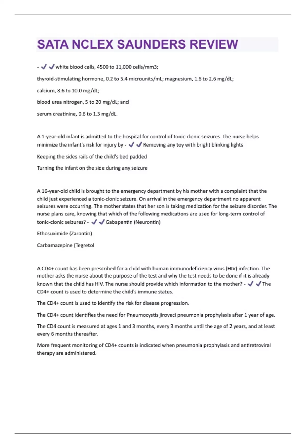 - white blood cells, 4500 to 11,000 cells/mm3; thyroid-stimulating hormone, 0.2 to 5.4 microunits/mL; magnesium, 1.6 to 2.6 mg/dL; calcium, 8.6 to 10.0 mg/dL; blood urea nitrogen, 5 to 20 mg/dL; and serum creatinine, 0.6 to 1.3 mg/dL. A 1-year-old infant is admitted to the hospital for control of tonic-clonic seizures. The nurse helps minimize the infant's risk for injury by - Removing any toy with bright blinking lights Keeping the sides rails of the child's bed padded Turning the infant on the side during any seizure A 16-year-old child is brought to the emergency department by his mother with a complaint that the child just experienced a tonic-clonic seizure. On arrival in the emergency department no apparent seizures were occurring. The mother states that her son is taking medication for the seizure disorder. The nurse plans care, knowing that which of the following medications are used for long-term control of tonic-clonic seizures? - Gabapentin (Neurontin) Ethosuximide (Zarontin) Carbamazepine (Tegretol A CD4+ count has been prescribed for a child with human immunodeficiency virus (HIV) infection. The mother asks the nurse about the purpose of the test and why the test needs to be done if it is already known that the child has HIV. The nurse should provide which information to the mother? - The CD4+ count is used to determine the child's immune status. The CD4+ count is used to identify the risk for disease progression. The CD4+ count identifies the need for Pneumocystis jiroveci pneumonia prophylaxis after 1 year of age. The CD4 count is measured at ages 1 and 3 months, every 3 months until the age of 2 years, and at least every 6 months thereafter. More frequent monitoring of CD4+ counts is indicated when pneumonia prophylaxis and antiretroviral therapy are administered.A child with sickle cell anemia is being discharged after treatment for a crisis. Which instructions should the nurse provide to prevent another crisis from occurring? - Drink plenty of fluids. Wash hands before meals and after playing. Report a sore throat immediately. Sickle cell crisis can be precipitated by cold, dehydration, stress, or infection. Increasing the amount of fluids will reduce the viscosity of blood, thus preventing vascular occlusion. A conscious effort to wash hands can improve the child's health by preventing infection. A sore throat is a sign of an infection and must be reported. It is important to avoid cold temperatures of any kind because this can cause vasoocclusion. Folic acid avoidance is not necessary. Children need to be encouraged to set their own limits in play. A client asks the nurse to describe how her developing baby will get enough blood and oxygen. The nurse responds that the fetal circulatory system accomplishes this task by which of the following? - Carrying more oxygen on fetal hemoglobin than maternal hemoglobin Making the fetal cardiac output higher per unit of body weight than the maternal cardiac output Bypassing the fetal lungs to circulate oxygen rich blood Using the fetus's beating heart to pump blood in the circulatory system The fetal lungs do not function for respiratory gas exchange, so a special circulatory pathway, the ductus arteriosus, bypasses the lungs. A small amount of blood circulates through the resistant lung tissue, but the majority follows the path with less resistance through the ductus arteriosus into the aorta. The following three special characteristics enable the fetus to obtain sufficient oxygen from maternal blood: fetal hemoglobin carries 20% to 30% more oxygen than maternal hemoglobin; the hemoglobin concentration of the fetus is about 50% greater than that of the mother; and the fetal heart rate is 110 to 160 beats per minute, making the cardiac output per unit of body weight higher than that of an adult A client enters the emergency room confused, twitching, and having seizures. His family states he recently was placed on corticosteroids for arthritis and was feeling better and exercising daily. Upon assessment, he has flushed skin, dry mucous membranes, an elevated temperature, and poor skin turgor. His serum sodium level is 172 mEq/L. Choose the interventions that the health care provider would likely prescribe. - Monitor intake and output. Monitor the vital signs. Monitor the electrolyte levels. Increase water intake orally. Provide a sodium-reduced diet