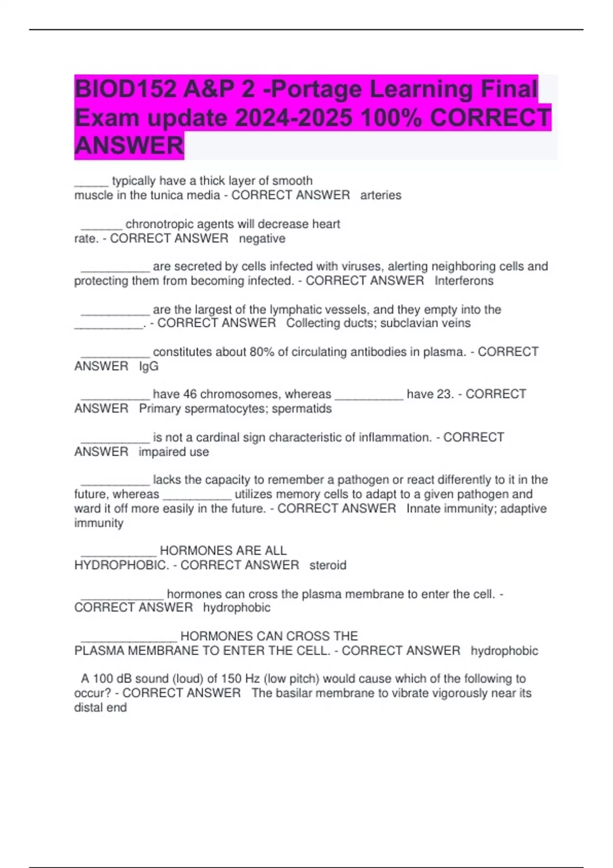 BIOD152 A&P 2 -Portage Learning Final Exam update % correct answer