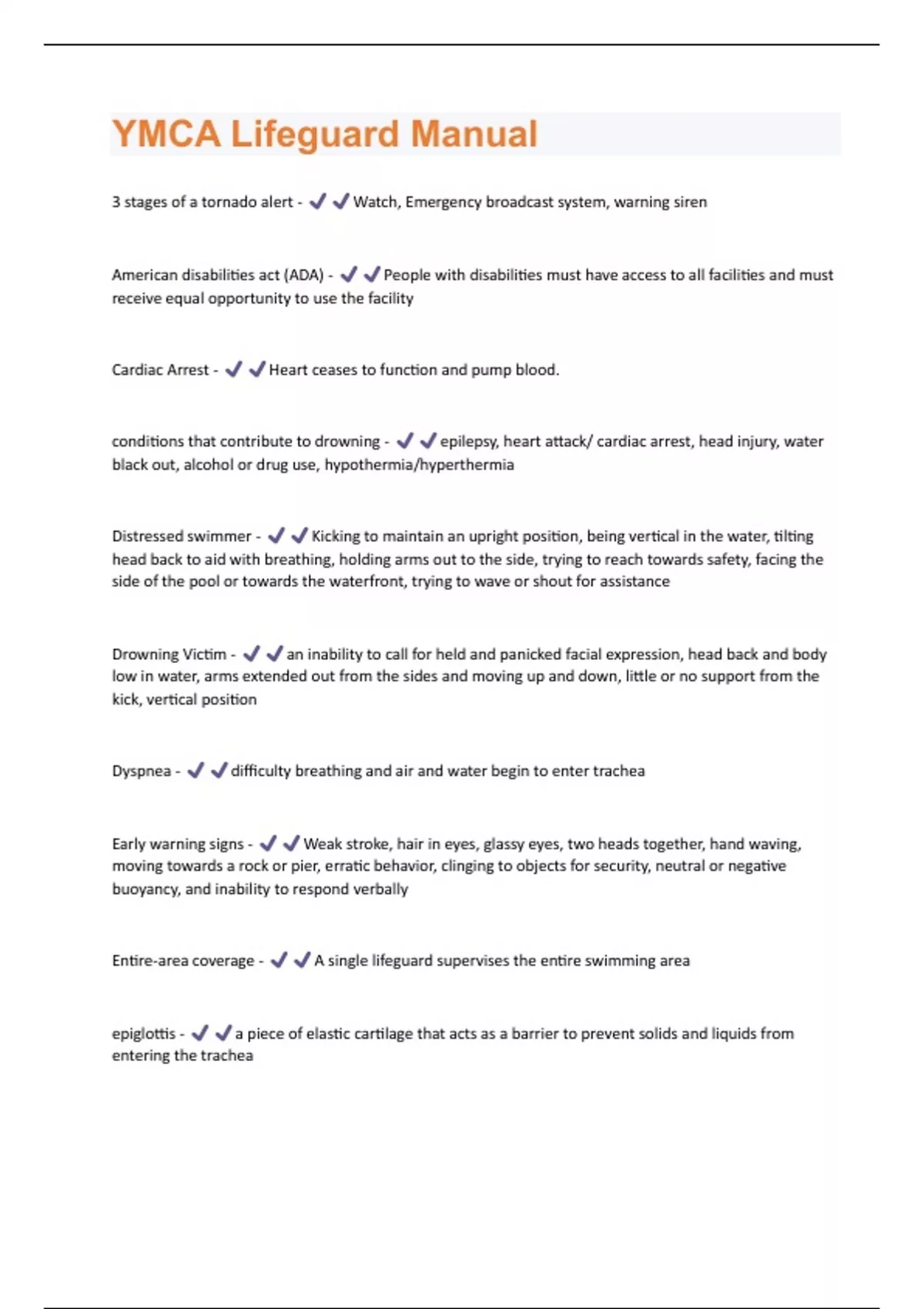 3 stages of a tornado alert - Watch, Emergency broadcast system, warning siren American disabilities act (ADA) - People with disabilities must have access to all facilities and must receive equal opportunity to use the facility Cardiac Arrest - Heart ceases to function and pump blood. conditions that contribute to drowning - epilepsy, heart attack/ cardiac arrest, head injury, water black out, alcohol or drug use, hypothermia/hyperthermia Distressed swimmer - Kicking to maintain an upright position, being vertical in the water, tilting head back to aid with breathing, holding arms out to the side, trying to reach towards safety, facing the side of the pool or towards the waterfront, trying to wave or shout for assistance Drowning Victim - an inability to call for held and panicked facial expression, head back and body low in water, arms extended out from the sides and moving up and down, little or no support from the kick, vertical position Dyspnea - difficulty breathing and air and water begin to enter trachea Early warning signs - Weak stroke, hair in eyes, glassy eyes, two heads together, hand waving, moving towards a rock or pier, erratic behavior, clinging to objects for security, neutral or negative buoyancy, and inability to respond verbally Entire-area coverage - A single lifeguard supervises the entire swimming area epiglottis - a piece of elastic cartilage that acts as a barrier to prevent solids and liquids from entering the tracheaesophagus - Carries solids and liquids from the throat to the stomache