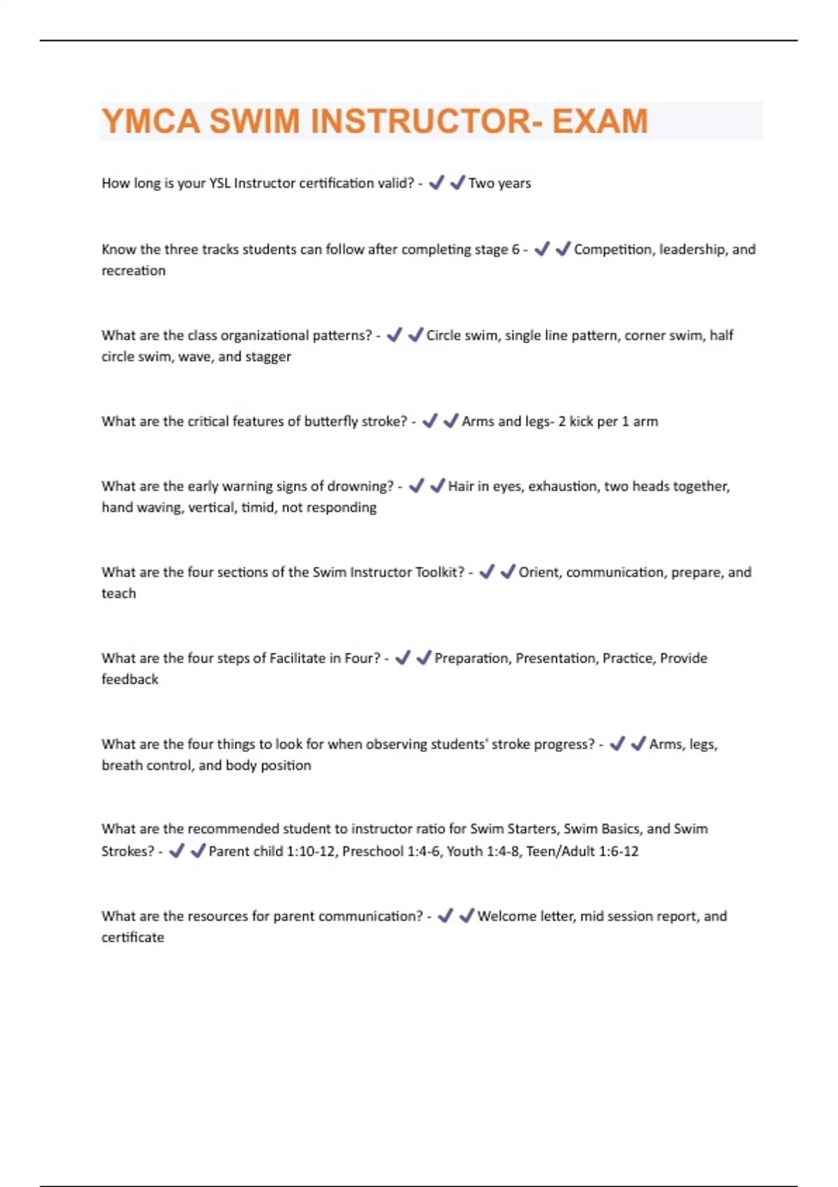 YMCA SWIM INSTRUCTOR- EXAM QUESTIONS & ANSWERS SCORED A+ TO PASS