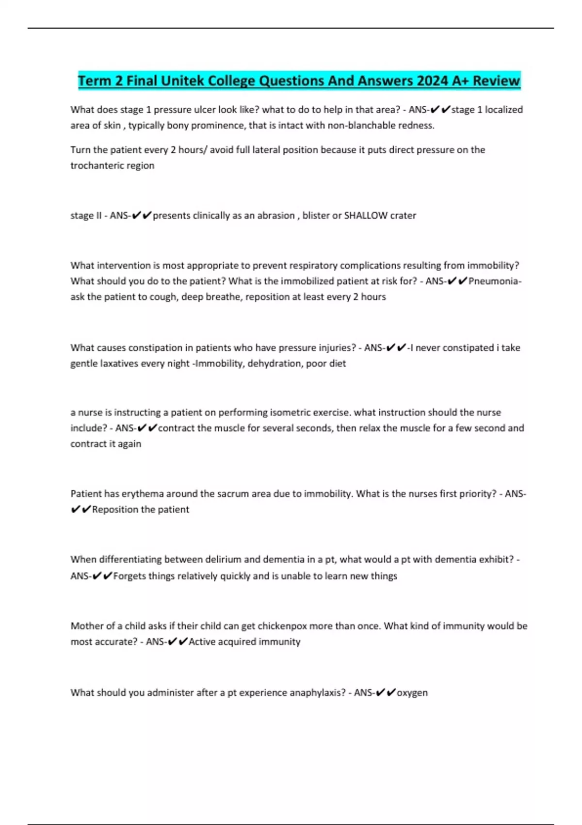 Term 2 Final Unitek College Questions And Answers 2024 A+ Review What does stage 1 pressure ulcer look like? what to do to help in that area? - ANS-stage 1 localized area of skin , typically bony prominence, that is intact with non-blanchable redness. Turn the patient every 2 hours/ avoid full lateral position because it puts direct pressure on the trochanteric region stage II - ANS-presents clinically as an abrasion , blister or SHALLOW crater What intervention is most appropriate to prevent respiratory complications resulting from immobility? What should you do to the patient? What is the immobilized patient at risk for? - ANS-Pneumoniaask the patient to cough, deep breathe, reposition at least every 2 hours What causes constipation in patients who have pressure injuries? - ANS