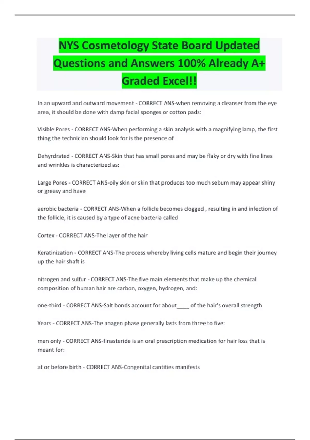 NYS Cosmetology State Board Updated Questions and Answers 100% Already A+ Graded Excel!! In an upward and outward movement - CORRECT ANS-when removing a cleanser from the eye area, it should be done with damp facial sponges or cotton pads: Visible Pores - CORRECT ANS-When performing a skin analysis with a magnifying lamp, the first thing the technician should look for is the presence of Dehyrdrated - CORRECT ANS-Skin that has small pores and may be flaky or dry with fine lines and wrinkles is characterized as: Large Pores - CORRECT ANS-oily skin or skin that produces too much sebum may appear shiny or greasy and have aerobic bacteria - CORRECT ANS-When a follicle becomes clogged , resulting in and infection of the follicle, it is caused by a type of acne bacteria called Cortex - CORRECT ANS-The layer of the hair Keratinization - CORRECT ANS-The process whereby living cells mature and begin their journey up the hair shaft is nitrogen and sulfur - CORRECT ANS-The five main elements that make up the chemical composition of human hair are carbon, oxygen, hydrogen, and: one-third - CORRECT ANS-Salt bonds account for about____ of the hair's overall strength Years - CORRECT ANS-The anagen phase generally lasts from three to five: men only - CORRECT ANS-finasteride is an oral prescription medication for hair loss that is meant for: at or before birth - CORRECT ANS-Congenital cantities manifests dry scalp - CORRECT ANS-Dandruff can easily be mistaken for fungus - CORRECT ANS-Dandruff is believed to be caused by a