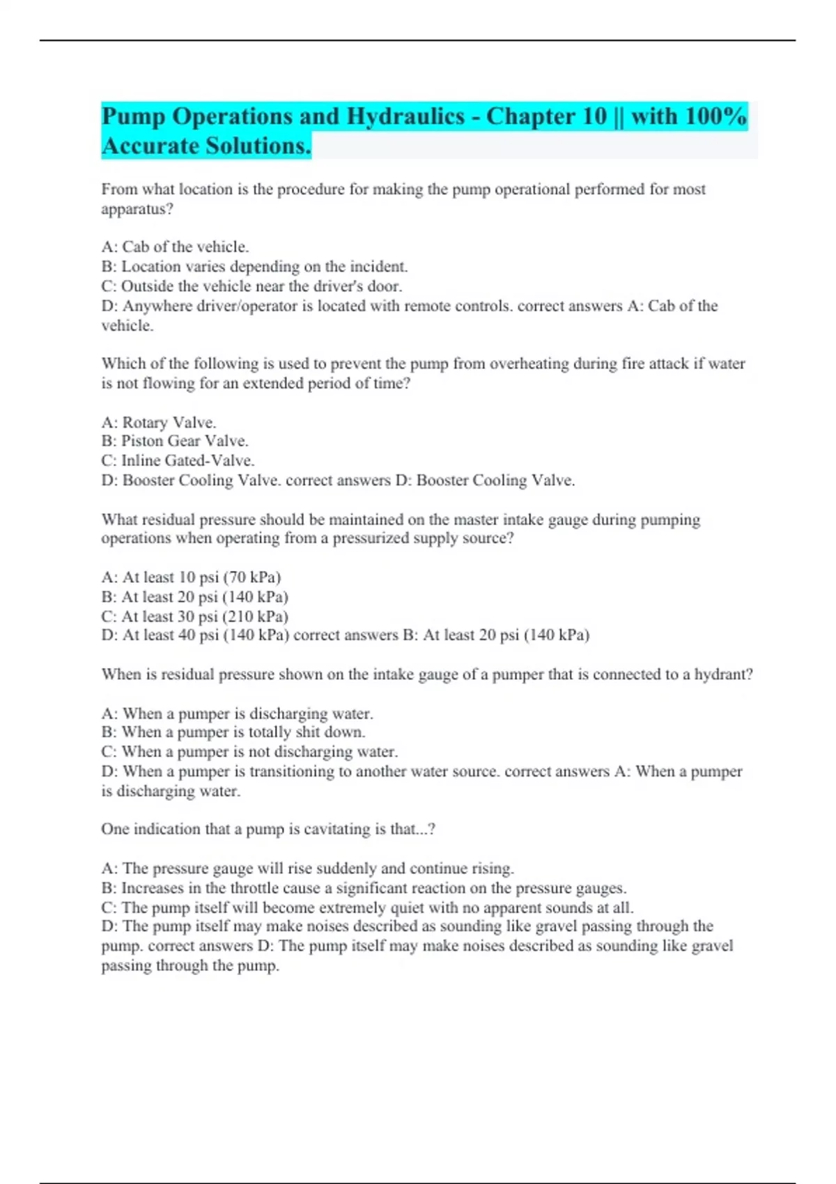 From what location is the procedure for making the pump operational performed for most apparatus? A: Cab of the vehicle. B: Location varies depending on the incident. C: Outside the vehicle near the driver's door. D: Anywhere driver/operator is located with remote controls. correct answers A: Cab of the vehicle. Which of the following is used to prevent the pump from overheating during fire attack if water is not flowing for an extended period of time? A: Rotary Valve. B: Piston Gear Valve. C: Inline Gated-Valve. D: Booster Cooling Valve. correct answers D: Booster Cooling Valve. What residual pressure should be maintained on the master intake gauge during pumping operations when operating from a pressurized supply source? A: At least 10 psi (70 kPa) B: At least 20 psi (140 kPa) C: At least 30 psi (210 kPa) D: At least 40 psi (140 kPa) correct answers B: At least 20 psi (140 kPa) When is residual pressure shown on the intake gauge of a pumper that is connected to a hydrant? A: When a pumper is discharging water. B: When a pumper is totally shit down. C: When a pumper is not discharging water. D: When a pumper is transitioning to another water source. correct answers A: When a pumper is discharging water. One indication that a pump is cavitating is that...? A: The pressure gauge will rise suddenly and continue rising. B: Increases in the throttle cause a significant reaction on the pressure gauges. C: The pump itself will become extremely quiet with no apparent sounds at all. D: The pump itself may make noises described as sounding like gravel passing through the pump. correct answers D: The pump itself may make noises described as sounding like gravel passing through the pump.