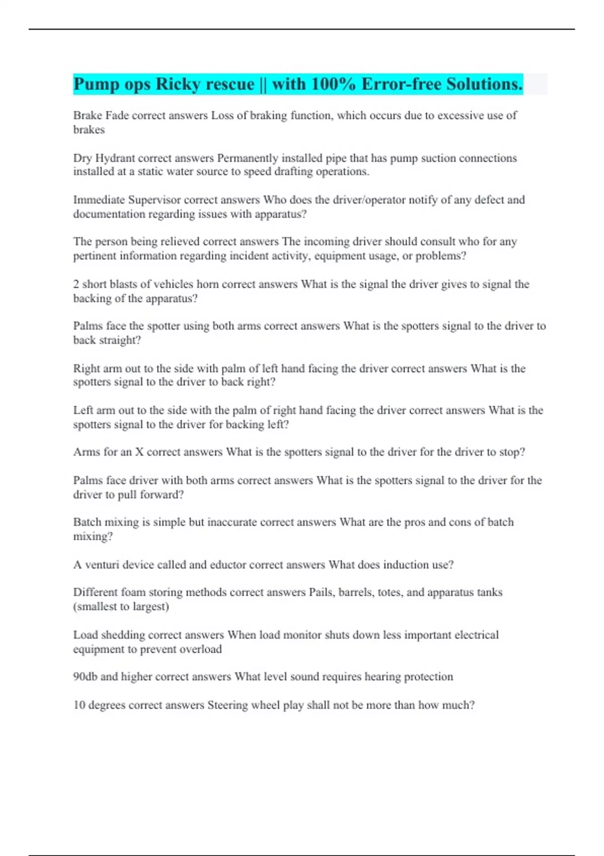 Brake Fade correct answers Loss of braking function, which occurs due to excessive use of brakes Dry Hydrant correct answers Permanently installed pipe that has pump suction connections installed at a static water source to speed drafting operations. Immediate Supervisor correct answers Who does the driver/operator notify of any defect and documentation regarding issues with apparatus? The person being relieved correct answers The incoming driver should consult who for any pertinent information regarding incident activity, equipment usage, or problems? 2 short blasts of vehicles horn correct answers What is the signal the driver gives to signal the backing of the apparatus? Palms face the spotter using both arms correct answers What is the spotters signal to the driver to back straight? Right arm out to the side with palm of left hand facing the driver correct answers What is the spotters signal to the driver to back right? Left arm out to the side with the palm of right hand facing the driver correct answers What is the spotters signal to the driver for backing left? Arms for an X correct answers What is the spotters signal to the driver for the driver to stop? Palms face driver with both arms correct answers What is the spotters signal to the driver for the driver to pull forward? Batch mixing is simple but inaccurate correct answers What are the pros and cons of batch mixing? A venturi device called and eductor correct answers What does induction use? Different foam storing methods correct answers Pails, barrels, totes, and apparatus tanks (smallest to largest) Load shedding correct answers When load monitor shuts down less important electrical equipment to prevent overload 90db and higher correct answers What level sound requires hearing protection 10 degrees correct answers Steering wheel play shall not be more than how much?