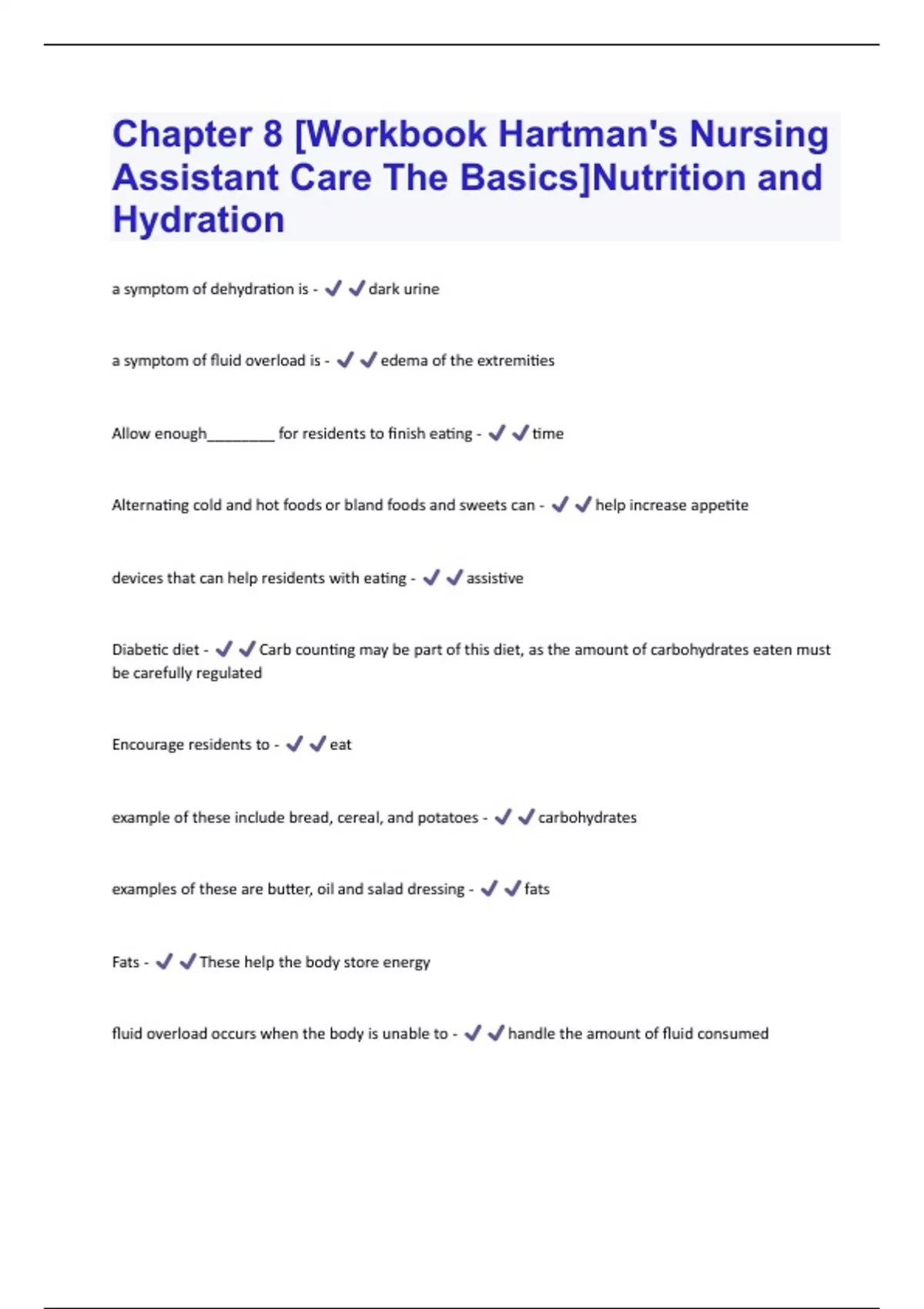 Chapter 8 [Workbook Hartman's Nursing Assistant Care The Basics]Nutrition and Hydration Updated 2024/2025 Actual Questions and answers with complete solutions