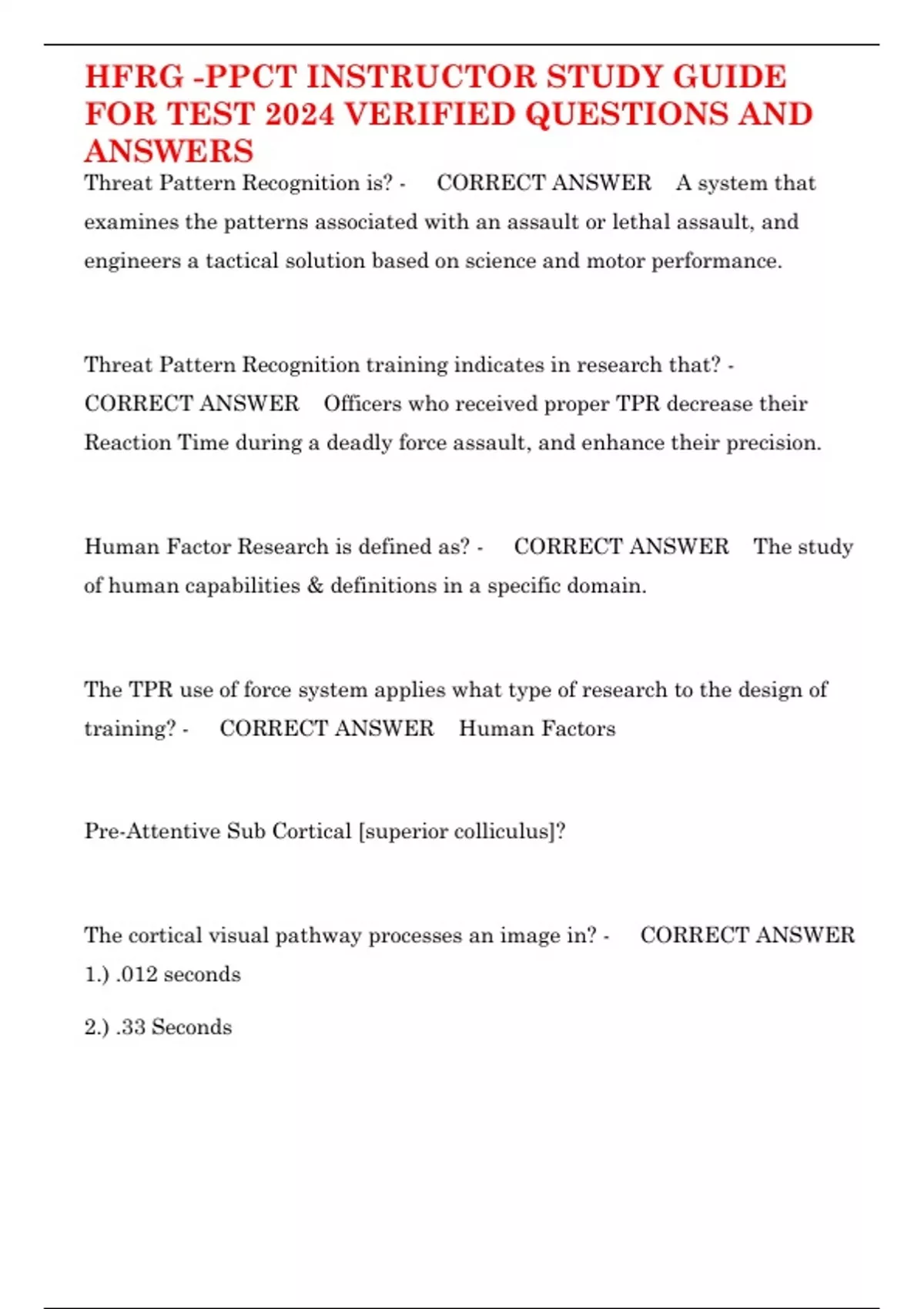 Threat Pattern Recognition is? - CORRECT ANSWER A system that examines the patterns associated with an assault or lethal assault, and engineers a tactical solution based on science and motor performance. Threat Pattern Recognition training indicates in research that? - CORRECT ANSWER Officers who received proper TPR decrease their Reaction Time during a deadly force assault, and enhance their precision. Human Factor Research is defined as? - CORRECT ANSWER The study of human capabilities & definitions in a specific domain. The TPR use of force system applies what type of research to the design of training? - CORRECT ANSWER Human Factors Pre-Attentive Sub Cortical [superior colliculus]? The cortical visual pathway processes an image in? - CORRECT ANSWER 1.) .012 seconds 2.) .33 Seconds Under stress, peripheral vision can be reduced by __% when the SNS is activated? - CORRECT ANSWER 70 As task difficulty or complexity increases, the optimum level arousal for effective response decreases. What term is this known as? - CORRECT ANSWER Inverted-U Law Human Factors is? - CORRECT ANSWER the study of human capabilities and human limitations in a specific domain. High-Risk Human Factors is defined as? - CORRECT ANSWER The study of human capabilities and limitations in a high risk environment that is dynamic (chaotic), fluid (uncertain), time compressed and life threatening. Officers feloniously killed with firearm: Distance - CORRECT ANSWER 0-5 Feet: 51.9% 6-10 Feet: 19.2% 0-10 Feet: 71.1% In Siddle's follow-up to Hontz's study regarding assailant response time, he found? - CORRECT ANSWER Assailant movement speed was .37 seconds. Siddle also found officer response time from the holster was 1.9 seconds without aiming, 2.4 seconds when aiming. The four components of Acceptability? - CORRECT ANSWER 1.)Tactical 2.)Legal 3.)Medical 4.) Human Factors Research Mental States in Combat - CORRECT ANSWER 1.) Combat Anxiety 2.) Survival Stress 3.) Combat Stress "The anticipation of danger", this application may lead to a gradual deterioration of both mental and physical skills. - CORRECT ANSWER Combat Anxiety