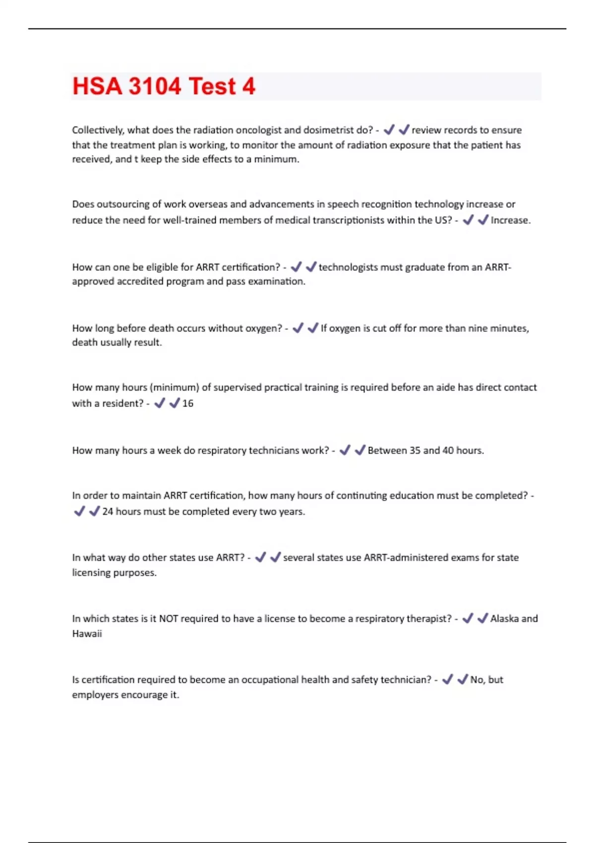 Collectively, what does the radiation oncologist and dosimetrist do? - review records to ensure that the treatment plan is working, to monitor the amount of radiation exposure that the patient has received, and t keep the side effects to a minimum. Does outsourcing of work overseas and advancements in speech recognition technology increase or reduce the need for well-trained members of medical transcriptionists within the US? - Increase. How can one be eligible for ARRT certification? - technologists must graduate from an ARRTapproved accredited program and pass examination. How long before death occurs without oxygen? - If oxygen is cut off for more than nine minutes, death usually result. How many hours (minimum) of supervised practical training is required before an aide has direct contact with a resident? - 16 How many hours a week do respiratory technicians work? - Between 35 and 40 hours. In order to maintain ARRT certification, how many hours of continuting education must be completed? - 24 hours must be completed every two years. In what way do other states use ARRT? - several states use ARRT-administered exams for state licensing purposes. In which states is it NOT required to have a license to become a respiratory therapist? - Alaska and Hawaii Is certification required to become an occupational health and safety technician? - No, but employers encourage it.To satisfy pre-veterinary course requirements, applicants much submit test scores from which exams? - The GRE, the VCAT, and the MCAT. What agency accredits the programs for graduates of Respiratory care? - The CAAHEP or the Committee on Accreditation for Respiratory Care (CoARC) What agency certifies candidates who want to be veterinary technicians and technologists? - The State Board of Veterinary Examiners (or the appropriate state agency) What agency is licensure is largely based on meeting requirements for certification from? - NBRC: National Board for Respiratory Care What agency offers certification for post-secondary training requirements and successfully passed the MLT (AAB) generalist examination? - American Association of Bioanalysts Medical Laboratory Technician. What are clinical documentation improvement specialists (CDI) responsible for? - the review of the patient's EHR and service as the liaison to the clinical treatment team in documenting clinical care. What are direct support professionals? - Aides who work with individuals who are developmentally or intellectually disabled. What are noninvasive technicians? - Vascular technologists, cardiac sonographers, cardiographic technicians. (perform ECGs, holter monitor, and stress tests) What are orderlies? - Hospital attendants or unlicensed assistive personnel. What are pharmaceuticalides used in? - they are used in nuclear medicine to diagnose and treat disease.What are radionuclides? (in nuclear medicine) - unstable atoms that emit radiation spontaneously, which are used to diagnose and treat disease? What are radiopharmaceuticals? - purified and compounded radionuclides