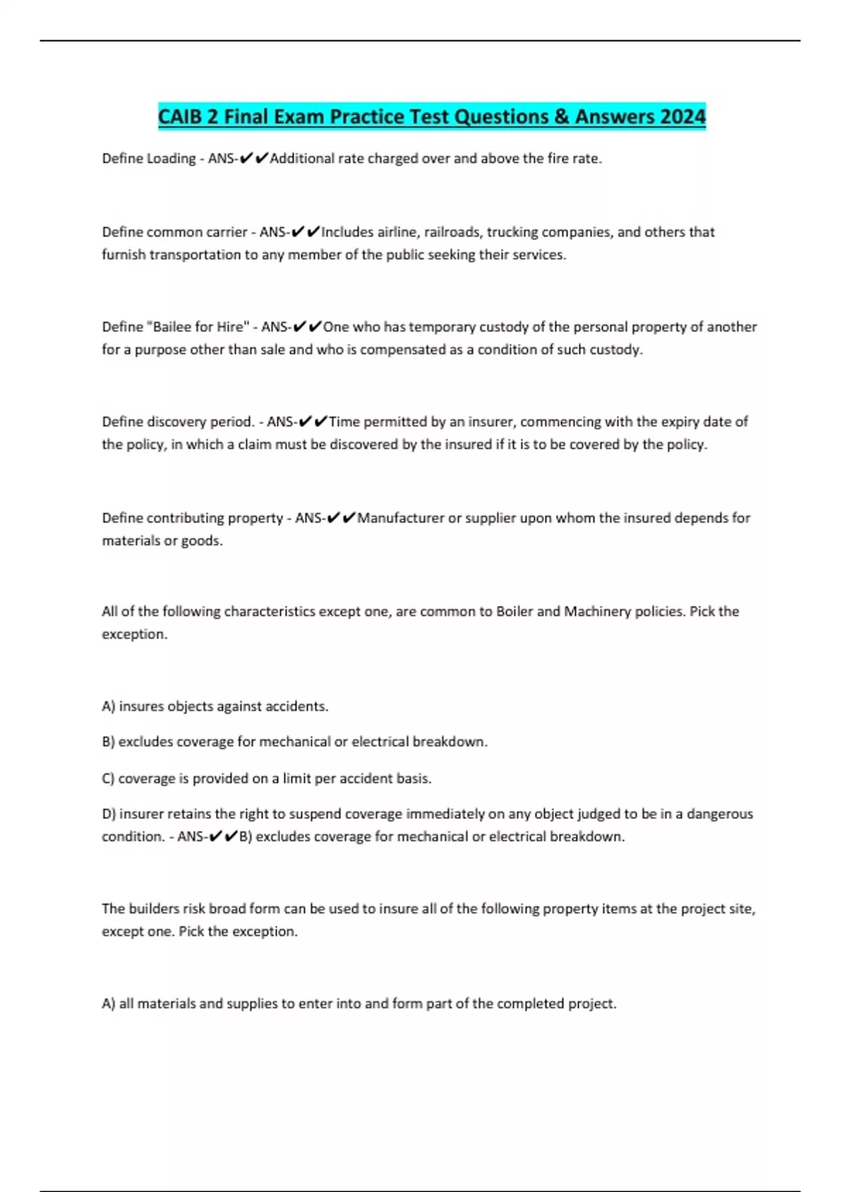 CAIB 2 Final Exam Practice Test Questions & Answers 2024 Define Loading - ANS-Additional rate charged over and above the fire rate. Define common carrier - ANS-Includes airline, railroads, trucking companies, and others that furnish transportation to any member of the public seeking their services. Define "Bailee for Hire" - ANS-One who has temporary custody of the personal property of another for a purpose other than sale and who is compensated as a condition of such custody. Define discovery period. - ANS-Time permitted by an insurer, commencing with the expiry date of the policy, in which a claim must be discovered by the insured if it is to be covered by the policy. Define contributing property - ANS-Manufacturer or supplier upon whom the insured depends for materials or goods. All of the following characteristics except one, are common to Boiler and Machinery policies. Pick the exception. A) insures objects against accidents. B) excludes coverage for mechanical or electrical breakdown. C) coverage is provided on a limit per accident basis. D) insurer retains the right to suspend coverage immediately on any object judged to be in a dangerous condition. - ANS...