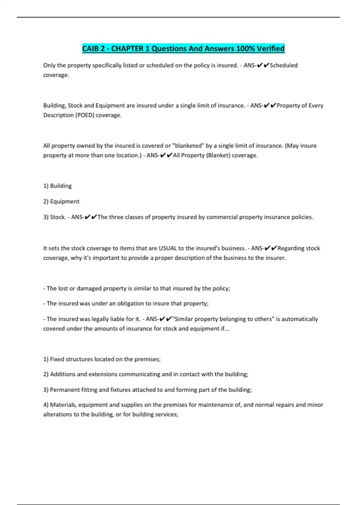 CAIB 2 - CHAPTER 1 Questions And Answers 100% Verified Only the property specifically listed or scheduled on the policy is insured. - ANS-Scheduled coverage. Building, Stock and Equipment are insured under a single limit of insurance. - ANS-Property of Every Description (POED) coverage. All property owned by the insured is covered or "blanketed" by a single limit of insurance. (May insure property at more than one location.) - ANS-All Property (Blanket) coverage. 1) Building 2) Equipment 3) Stock. - ANS-The three classes of property insured by commercial property insurance policies. It sets the stock coverage to items that are USUAL to the insured's business. - ANS-Regarding stock coverage, why it's important to provide a proper description of the business to the insurer. - The lost or damaged property is similar to that insured by the policy; - The insured was under an obligation to insure that property; - The insured was legally liable for it. - ANS-"Similar property belonging to others" is automatically covered under the amounts of insurance for stock and equipment if... 1) Fixed structures located on the premises; 2) Additions and extensions communicating and in contact with the building; 3) Permanent fitting and fixtures attached to and forming part of the building; 4) Materials, equipment and supplies on the premises for maintenance of, and normal repairs and minor alterations to the building, or for building services; Continues...