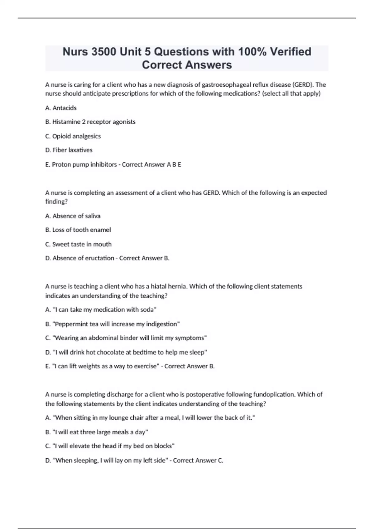Nurs 3500 Unit 5 Questions with 100% Verified Correct Answers A nurse is caring for a client who has a new diagnosis of gastroesophageal reflux disease (GERD). The nurse should anticipate prescriptions for which of the following medications? (select all that apply) A. Antacids B. Histamine 2 receptor agonists C. Opioid analgesics D. Fiber laxatives E. Proton pump inhibitors - Correct Answer A B E A nurse is completing an assessment of a client who has GERD. Which of the following is an expected finding? A. Absence of saliva B. Loss of tooth enamel C. Sweet taste in mouth D. Absence of eructation - Correct Answer B. A nurse is teaching a client who has a hiatal hernia. Which of the following client statements indicates an understanding of the teaching? A. "I can take my medication with soda" B. "Peppermint tea will increase my indigestion" C. "Wearing an abdominal binder will limit my symptoms" D. "I will drink hot chocolate at bedtime to help me sleep" E. "I can lift weights as a way to exercise" - Correct Answer B. A nurse is completing discharge for a client who is postoperative following fundoplication. Which of the following statements by the client indicates understanding of the teaching? A. "When sitting in my lounge chair after a meal, I will lower the back of it." B. "I will eat three