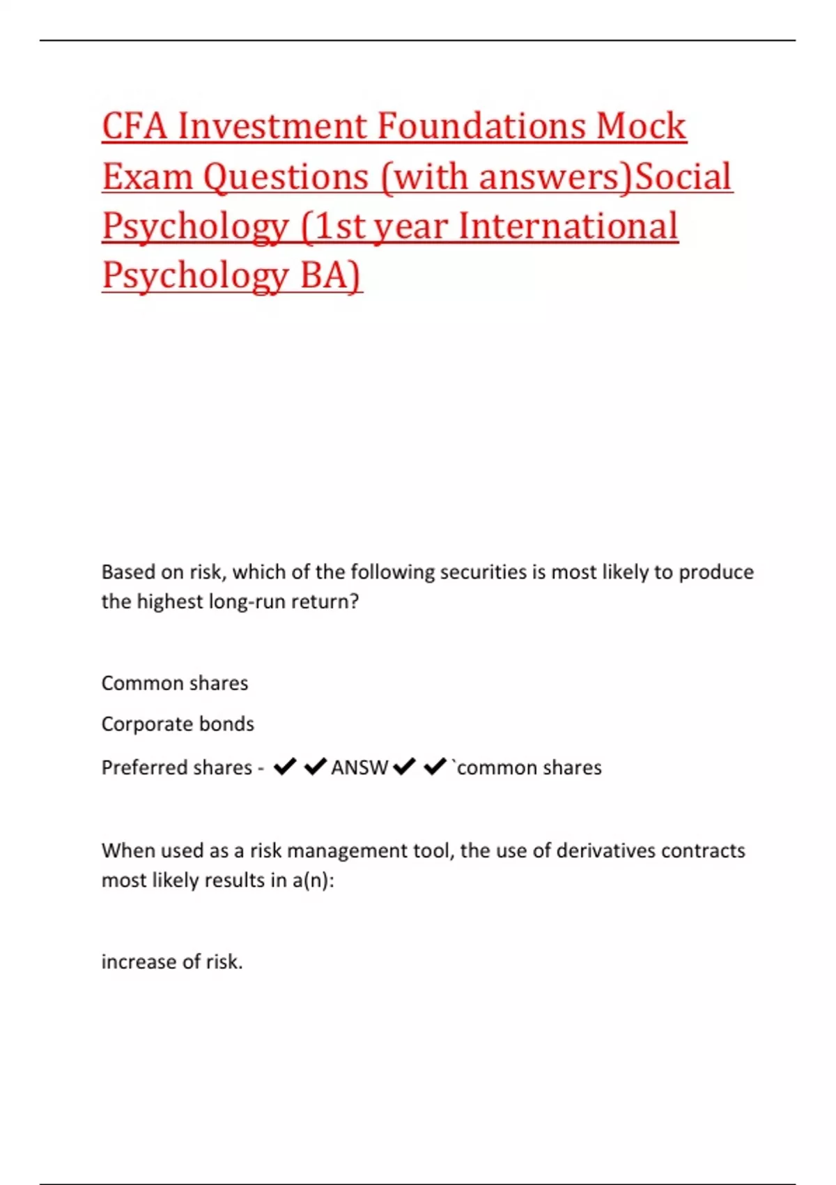 CFA Investment Foundations Mock Exam Questions (with answers)Social Psychology (1st year International Psychology BA)