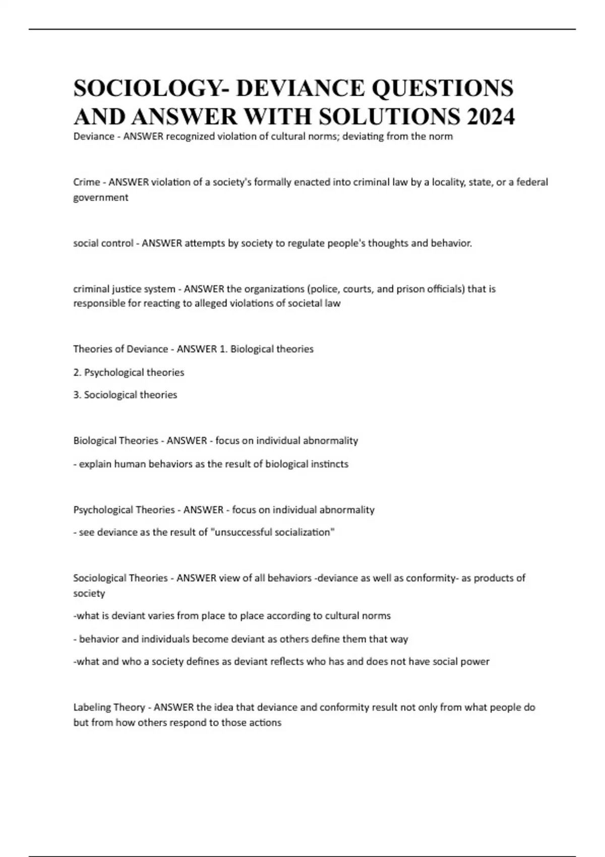 SOCIOLOGY- DEVIANCE QUESTIONS AND ANSWER WITH SOLUTIONS 2024