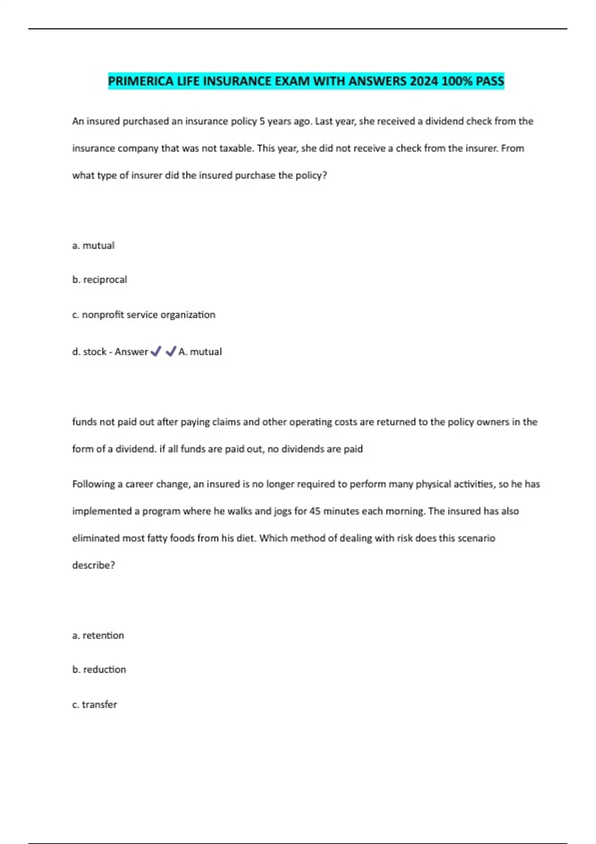 PRIMERICA LIFE INSURANCE EXAM WITH ANSWERS 2024 100% PASS An insured purchased an insurance policy 5 years ago. Last year, she received a dividend check from the insurance company that was not taxable. This year, she did not receive a check from the insurer. From what type of insurer did the insured purchase the policy? a. mutual b. reciprocal c. nonprofit service organization d. stock - Answer A. mutual funds not paid out after paying claims and other operating costs are returned to the policy owners in the form of a dividend. if all funds are paid out, no dividends are paid Following a career change, an insured is no longer required to perform many physical activities, so he has implemented a program where he walks and jogs for 45 minutes each morning. The insured has also eliminated most fatty foods from his diet. Which method of dealing with risk does this scenario describe? a. retention b. reduction c. transfer d. avoidance - Answer B. reduction the insured's change in lifestyle and habits would likely reduce the chances of health problems In insurance, an offer is usually made when a. an applicant submits an application to the insurer b. the insurer approves the application and receives the initial premium c. the agent hands the policy to the policyholder d. an agent explains a policy to a potential applicant - Answer A. an applicant submits an application to the insurer in insurance, the offer is usually made by the applicant in the form of an application. acceptance takes place when an insurer's underwriter approves the application and issues a policy the causes of loss insured against in an insurance policy are known as a. perils b. losses c. risks d. hazards - Answer A. perils perils are the causes of loss insured against in an insurance policy what documentation grants express authority to an agent? a. agents contract with the principal b. agents insurance license c. fiduciary contract d. state provisions - Answer A. agents contract with the principal the principal grants authority to an agent through the agent's contract which of the following best describes an insurance company that has been formed under the laws of this state? a. domestic b. sovereign c. alien d. foreign - Answer A. domestic a company is domestic when doing business within the state in which it is incorporated which of the following factors is NOT considered by an underwriter when determining the premium rates for an individual seeking insurance? a. medical history b. sex c. age d. race - Answer D. race